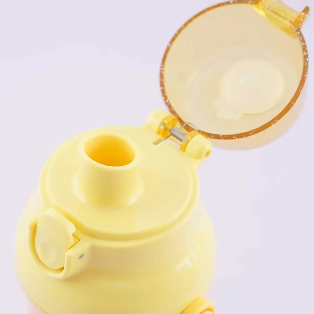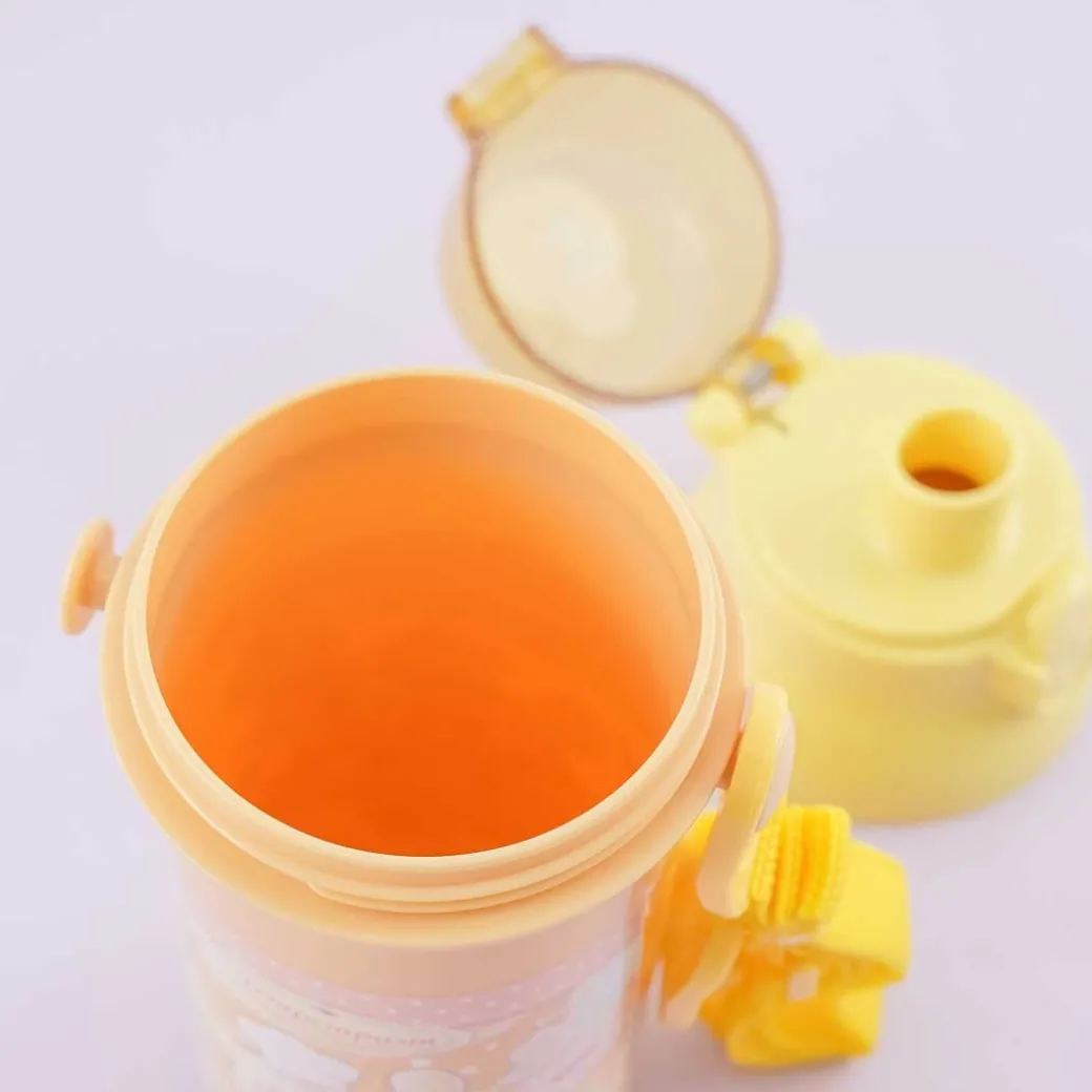 - A kawaii drinking bottle featuring prints of Pompompurin getting ready to eat pancakes