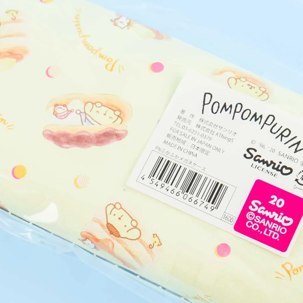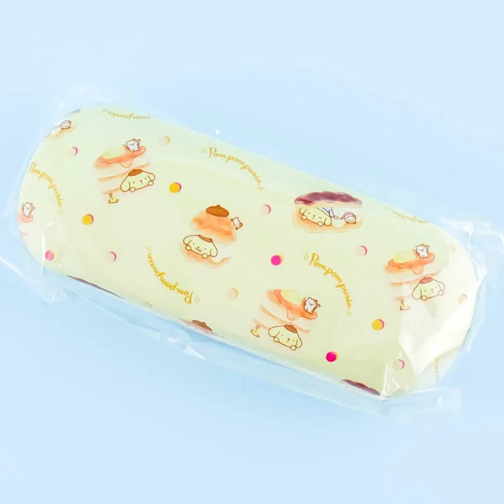 - A super kawaii eyeglass hard case featuring Pompompurin playing with pancakes and cream puffs