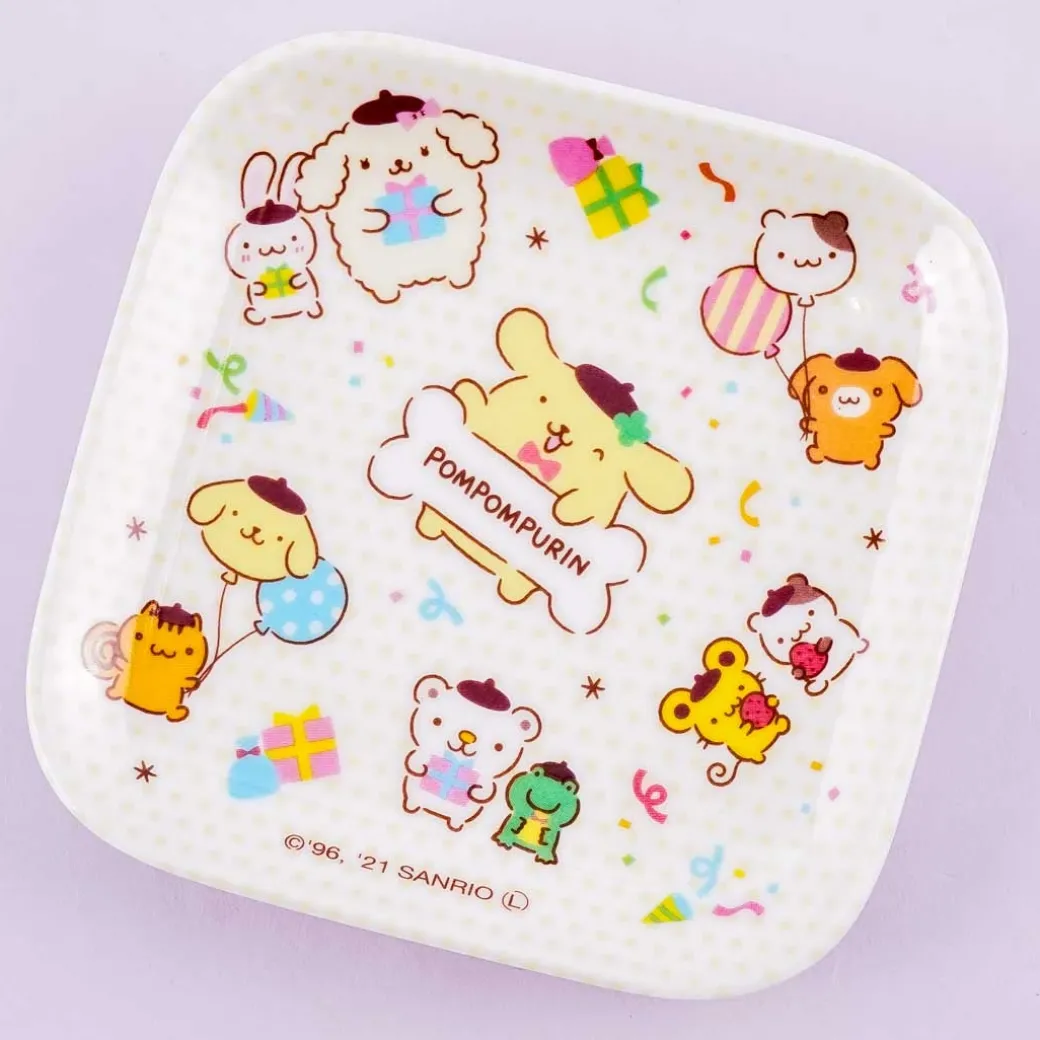 - A cute small square plate illustrated with Pompompurin and his friends at a party