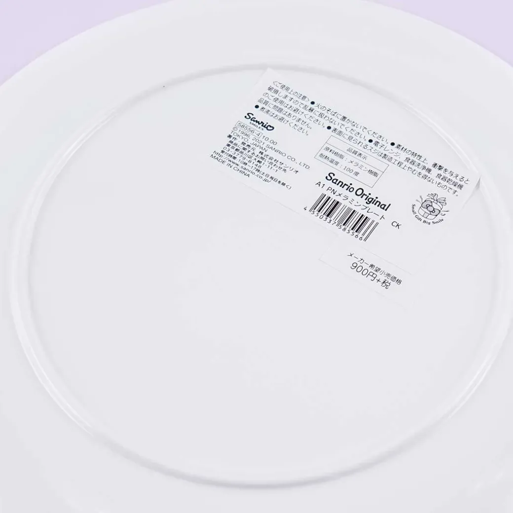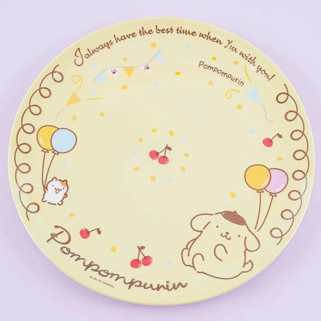 - A round plate with illustrations of Pompomurin, Muffin, balloons, and cherries