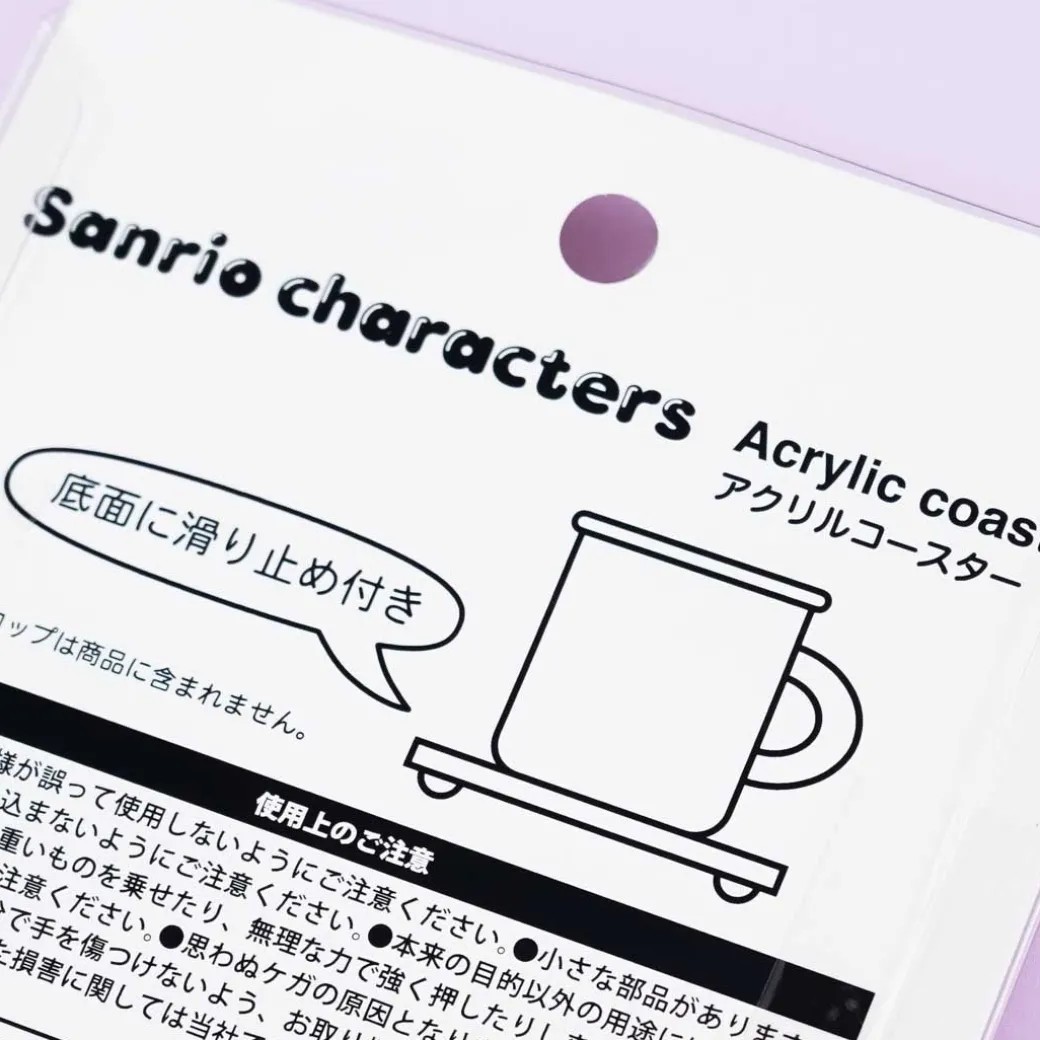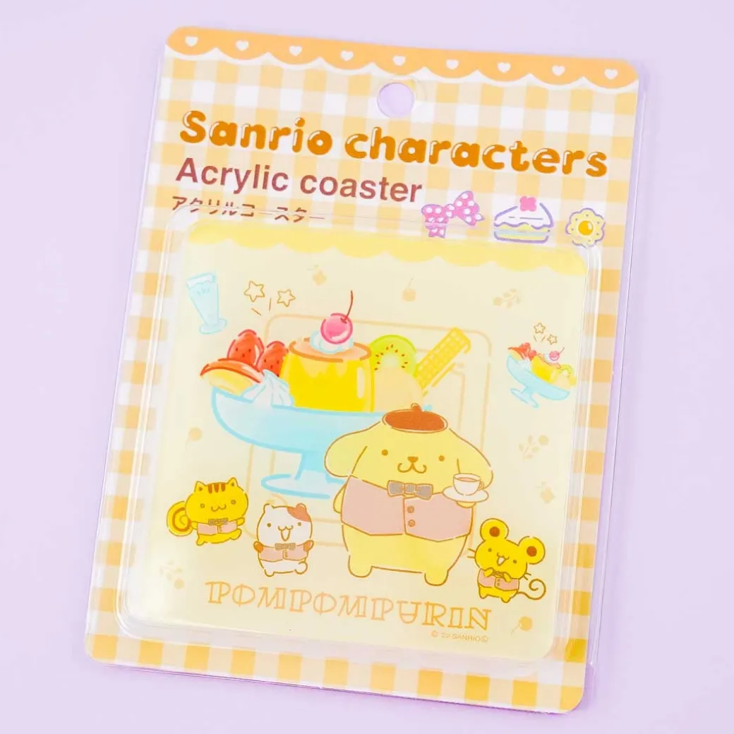 - A cute acrylic coaster showcasing Pompompurin and his friends in a cafe with pudding