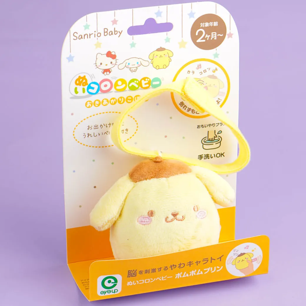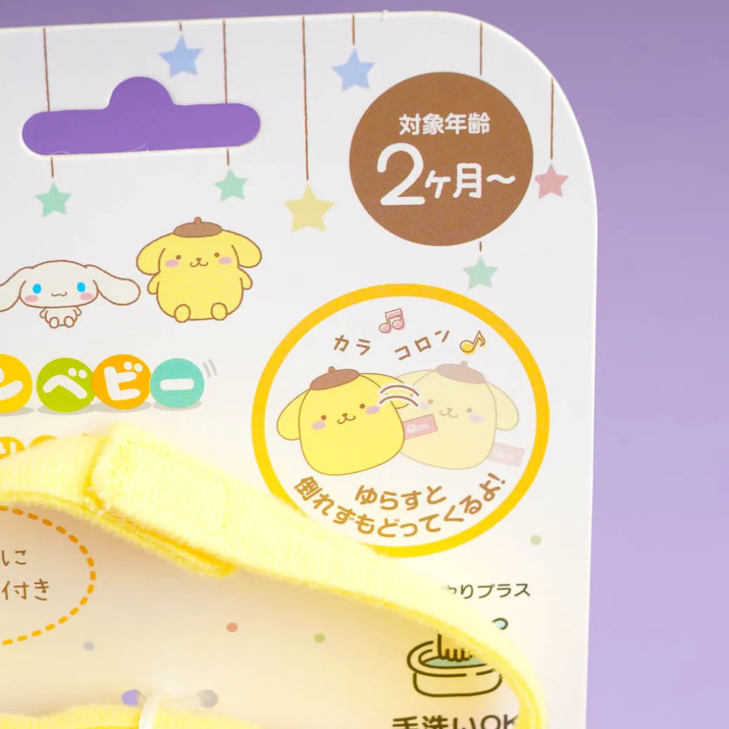 Pompompurin looks super cute in a roly-poly shape that rolls back and forth without falling over! It also makes a gentle ringing sound and comes with a velcro belt that you can easily attach to a crib or stroller. This medium-sized plushie is the perfect gift for babies as young as 2 months!