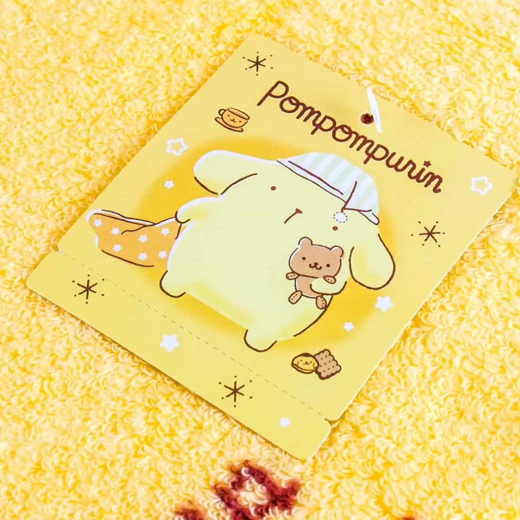 - A cute bath towel featuring prints of Pompompurin getting ready to sleep