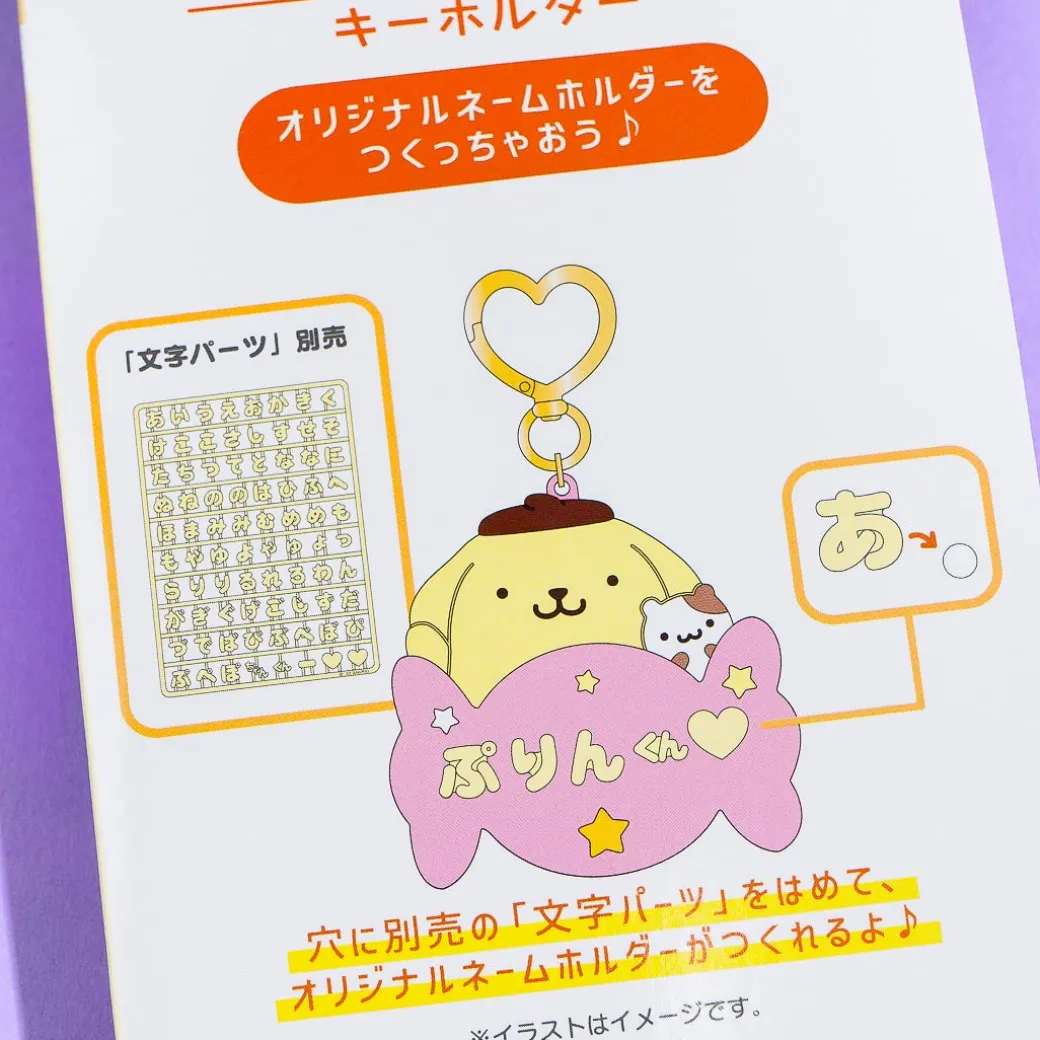This super kawaii keychain features Pompompurin with giant candy! It comes with a heart-shaped metal clip for attaching your keys. You can even customize this accessory by adding Japanese hiragana characters into the holes!