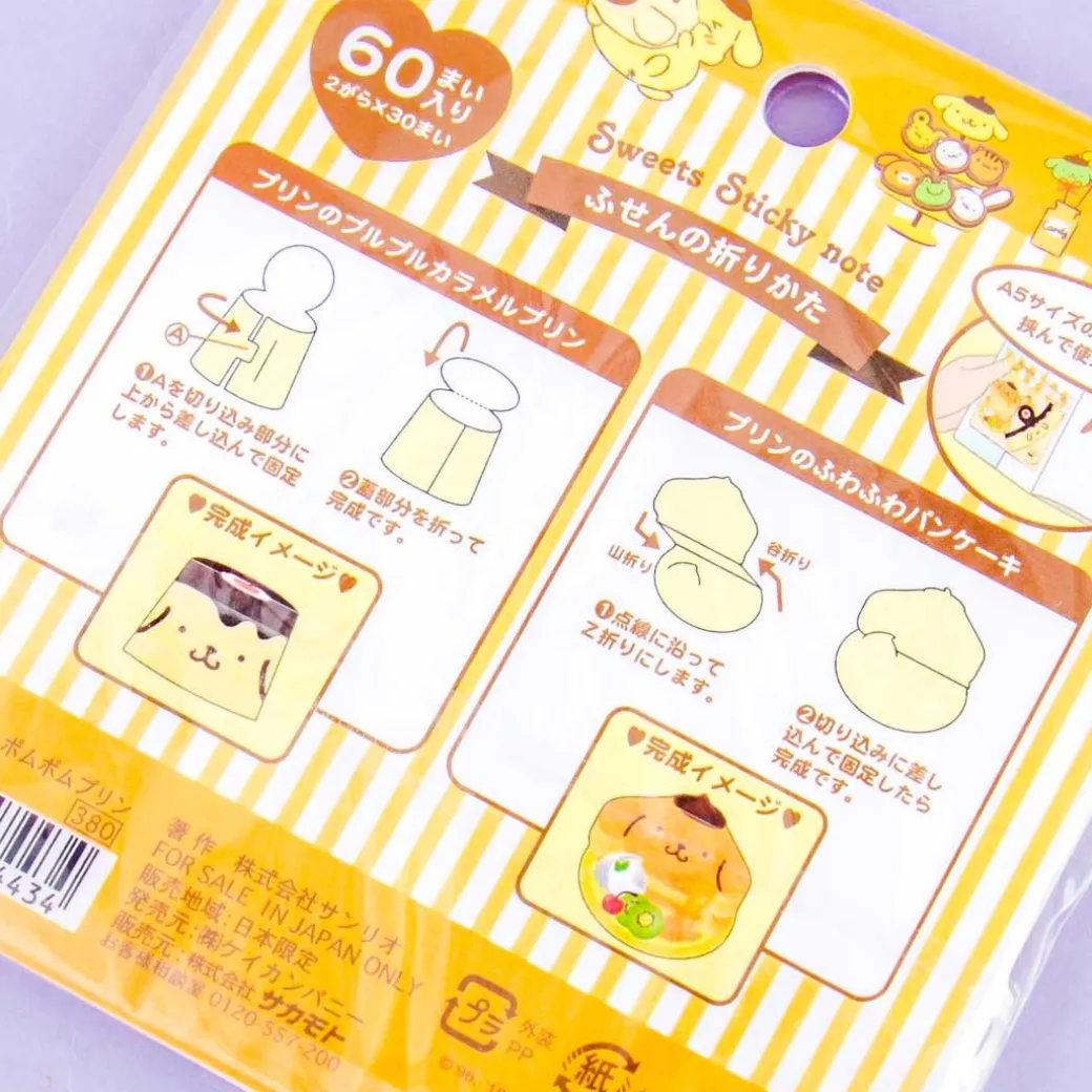 - A set of foldable sticky bookmarks featuring Pompompurin, Japanese pancake, and a pudding