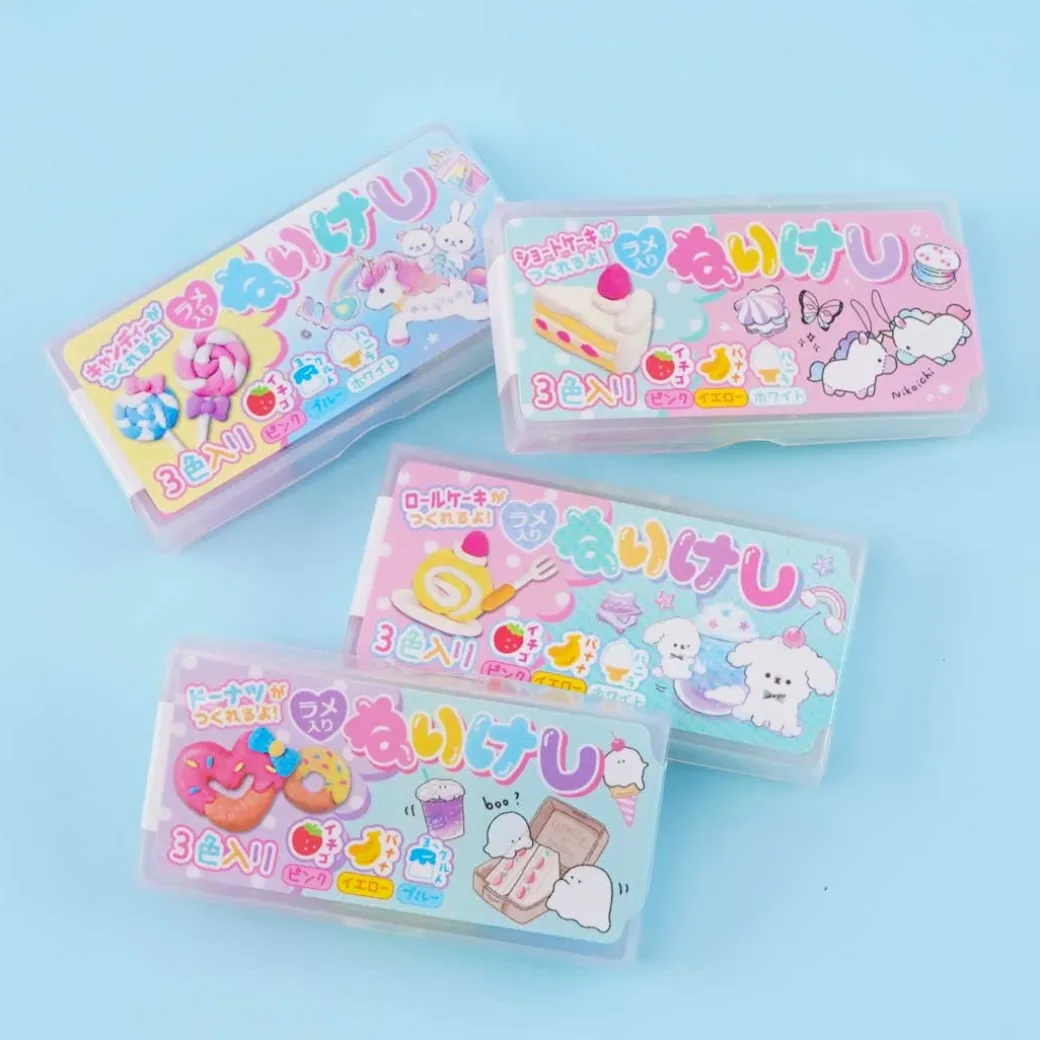 - A cute pack of colorful erasers featuring prints of candy and other kawaii things