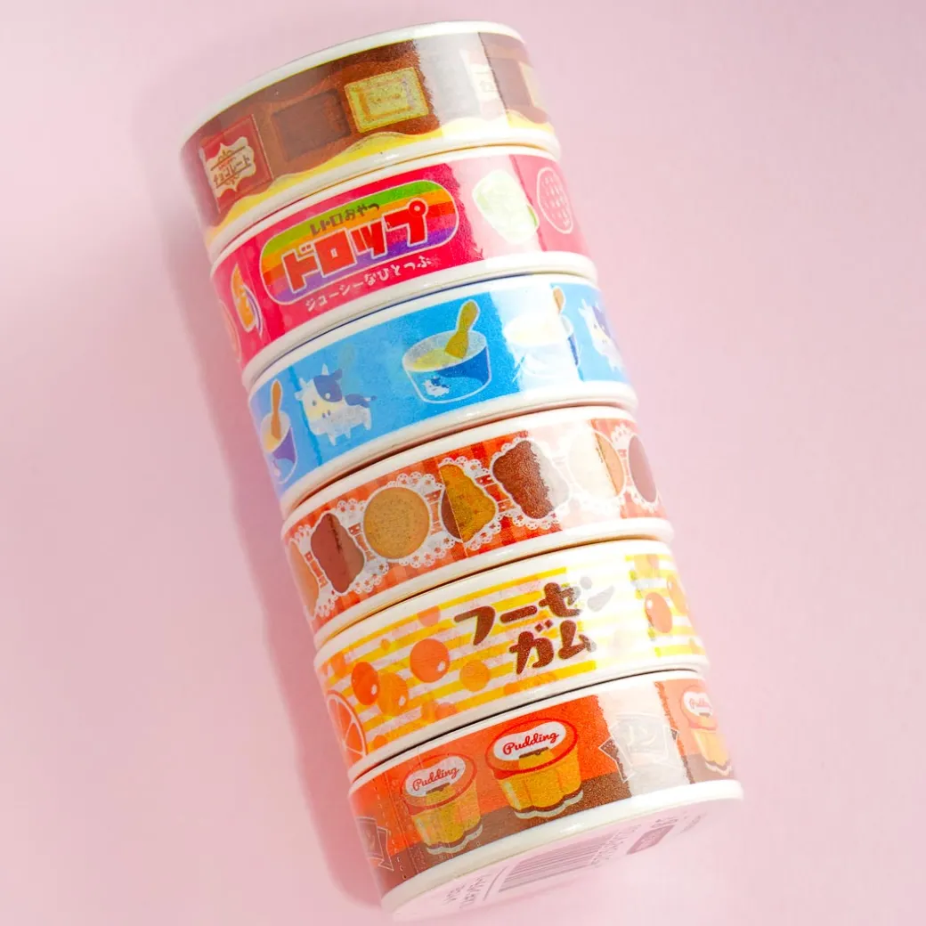 Decorate the edges of your scrapbook with this kawaii roll of masking tape! It’s decorated with prints that look like vintage Japanese snack packaging.