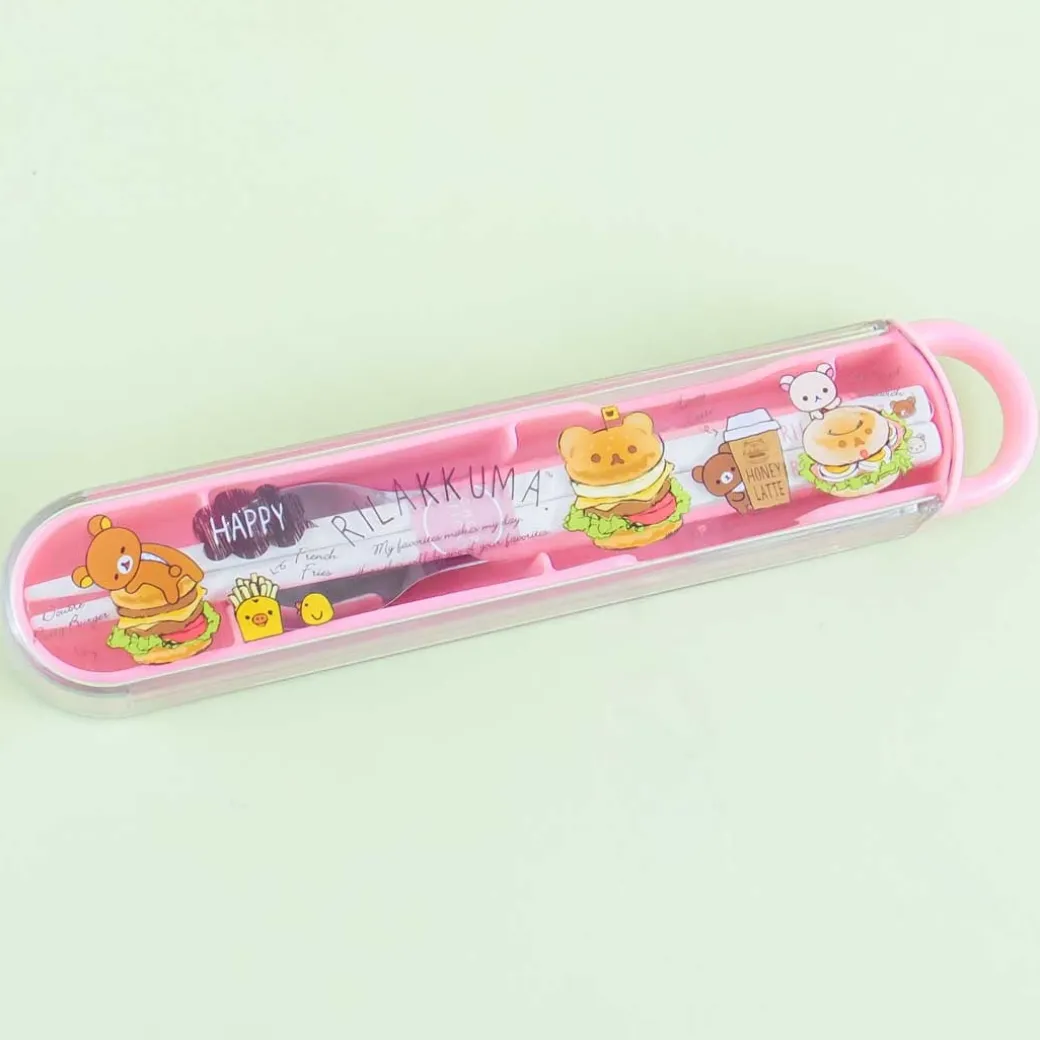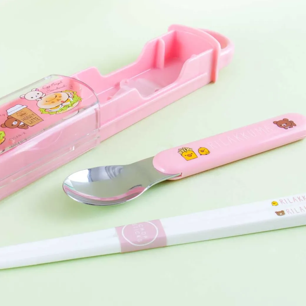 - A super cute utensil set featuring Rilakkuma characters playing with burger mals