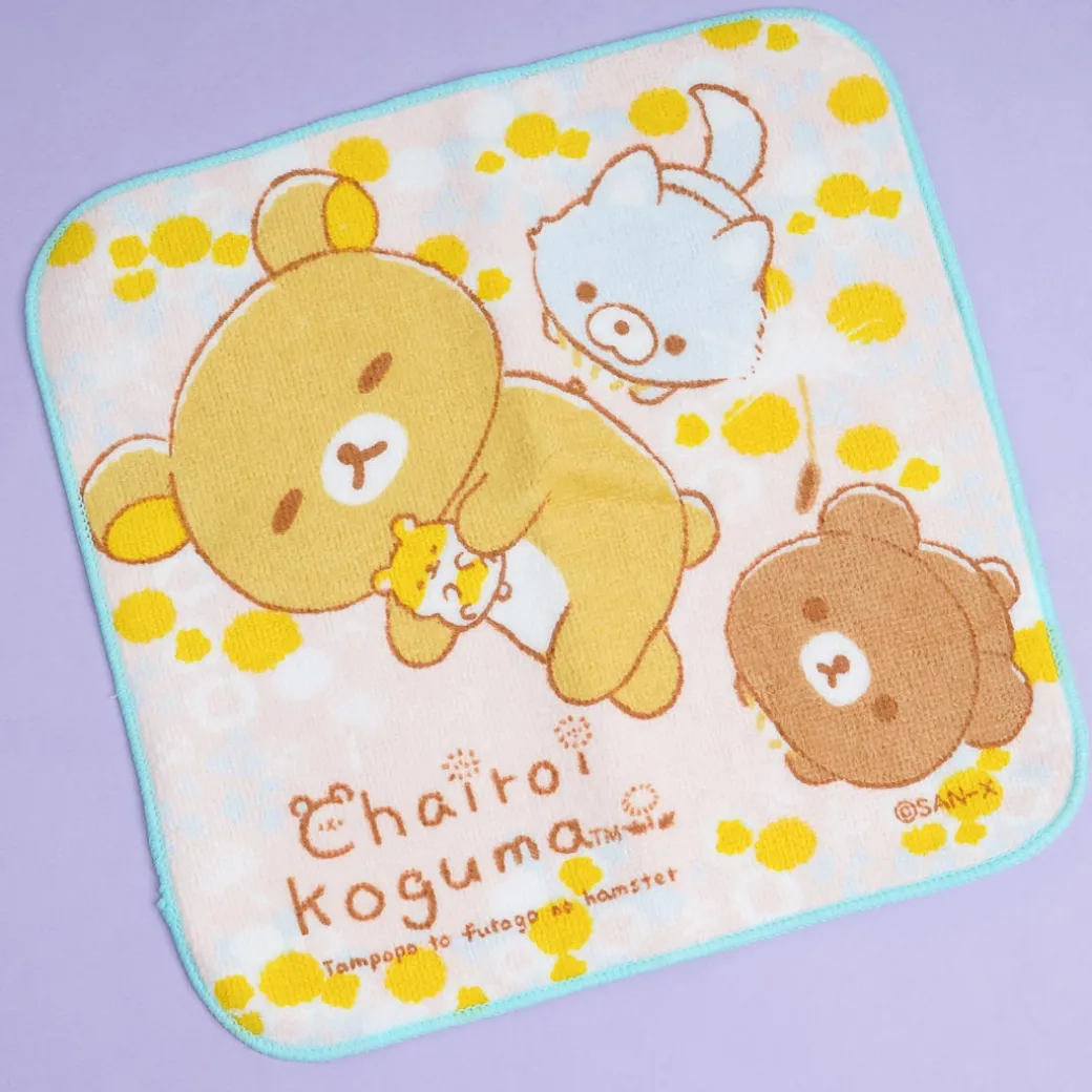 This kawaii hand towel features a sleepy Rilakkuma holding a hamster with Chairoikoguma surrounded by dandelion. You can use this to keep your hand clean while you’re outside.