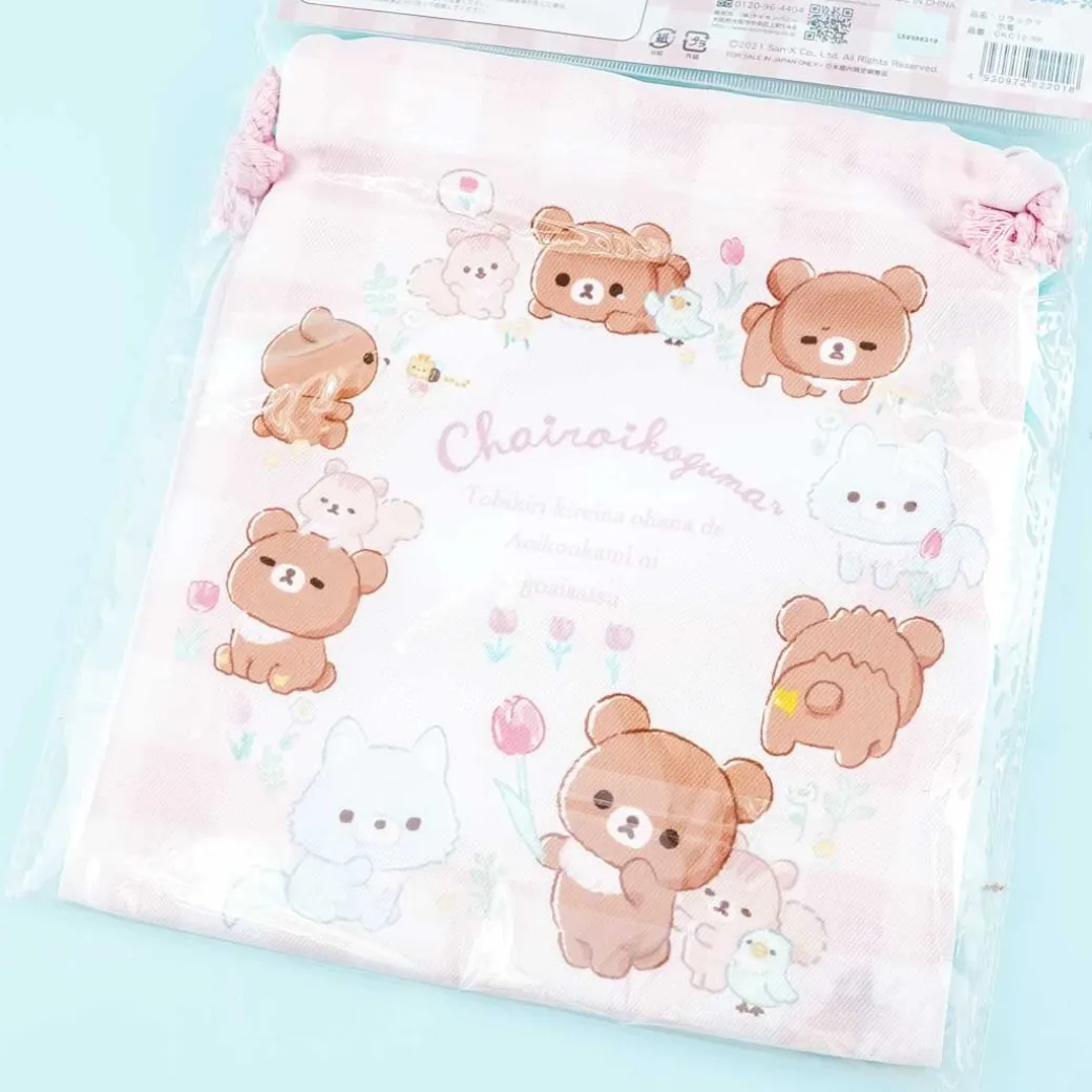 - A kawaii drawstring bag with prints of Rilakkuma and friends playing together in a garden