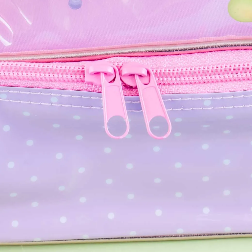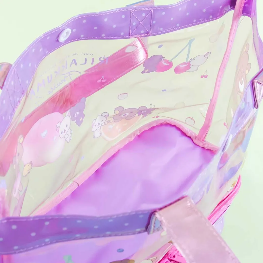 - A clear tote bag with illustrations of Rilakkuma and friends playing with fruits