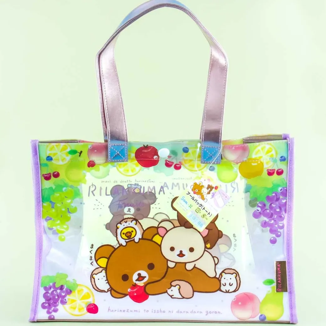 - A kawaii semi-transparent tote bag featuring prints of Rilakkuma characters with fruits