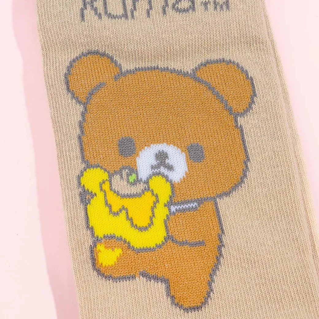 Keep your feet comfy and cute when you wear these Rilakkuma socks! They have kawaii prints of Chairoikoguma holding a jar of honey.