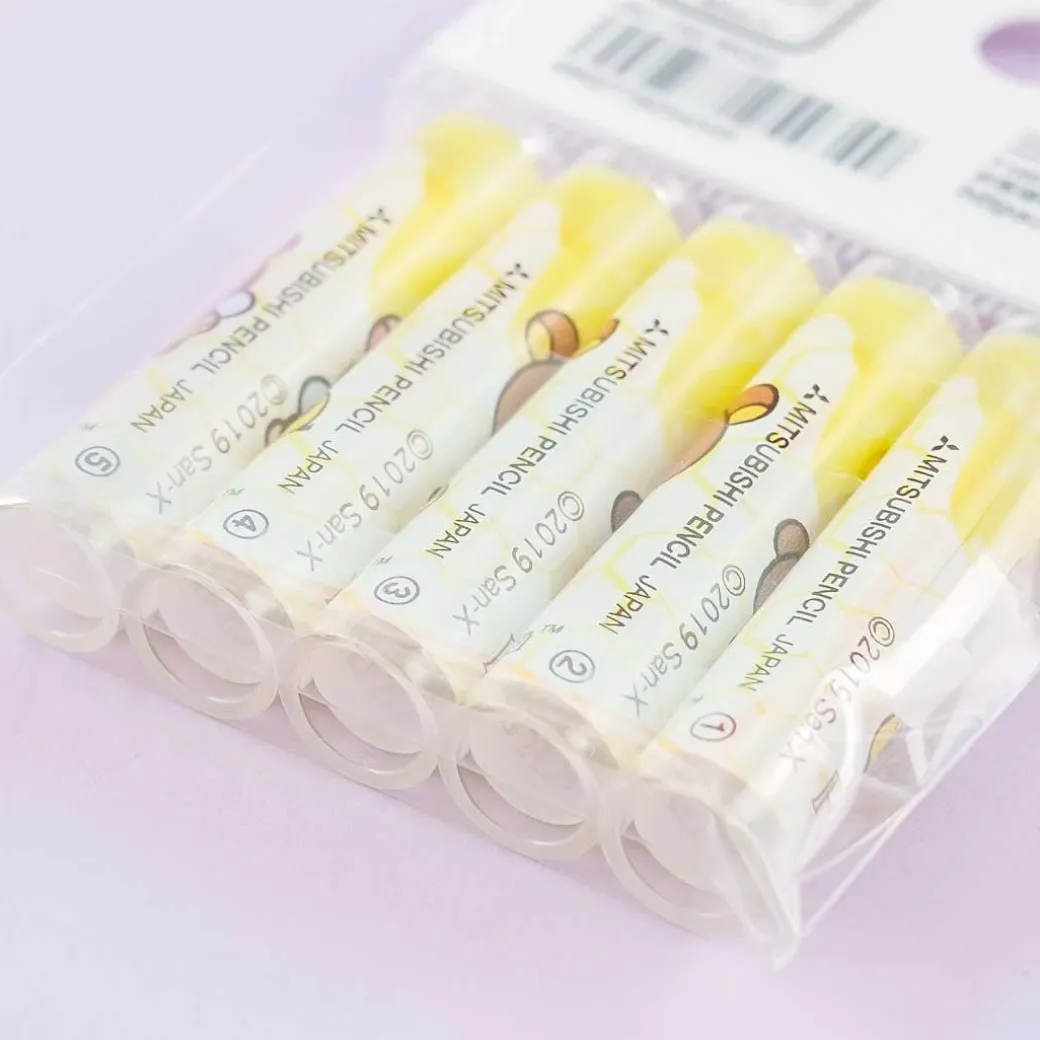 - A kawaii set of pencil caps featuring prints of Rilakkuma and his friends enjoying some honey