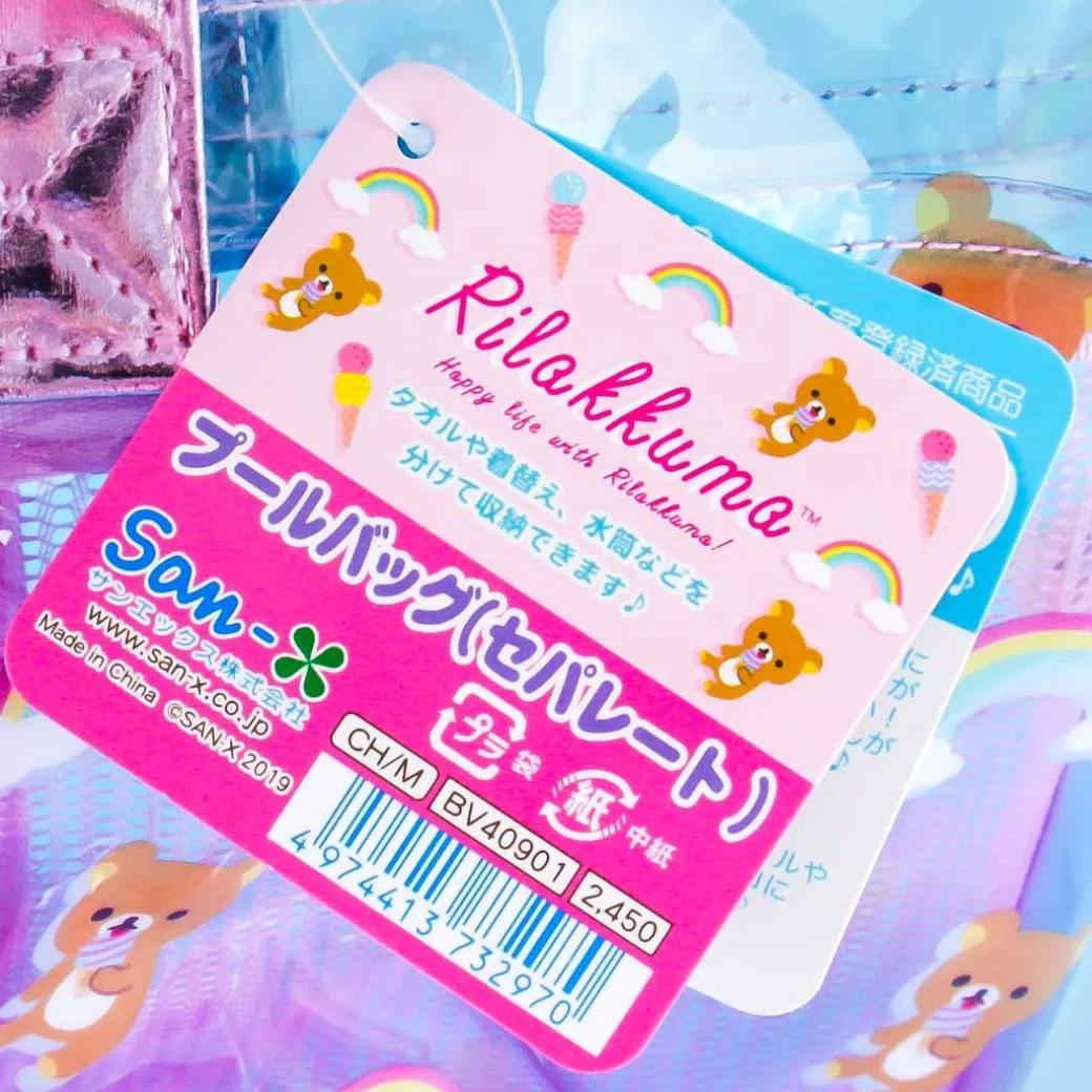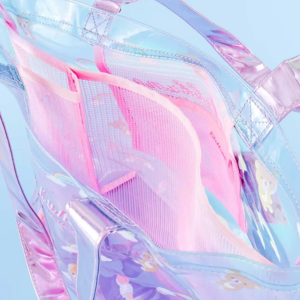 - A super cute transparent tote bag illustrated with Rilakkuma, rainbows, and ice cream