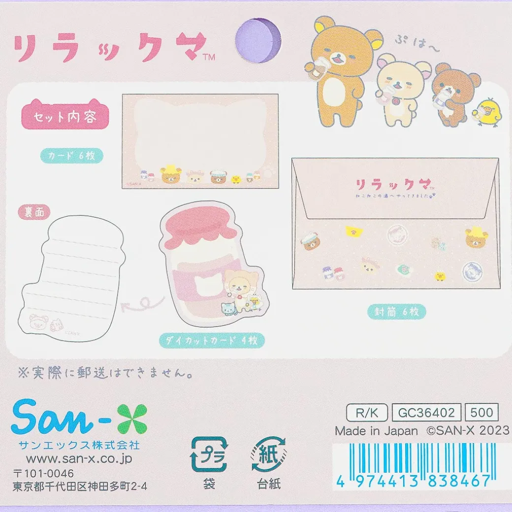 Add this cute letter set to your stationery collection! It features kawaii prints of Rilakkuma in a public bathhouse and a die-cut strawberry milk illustration. This set is perfect for sending short letters to your buddies!