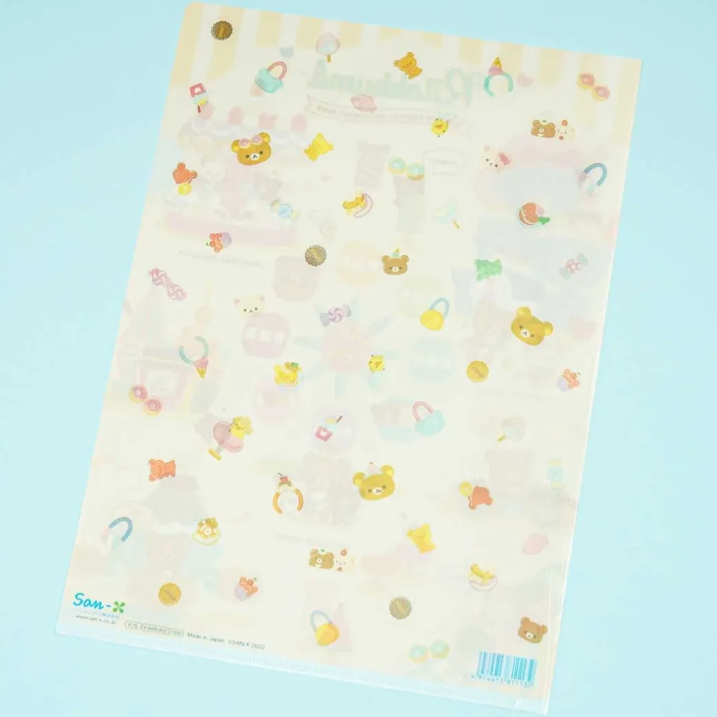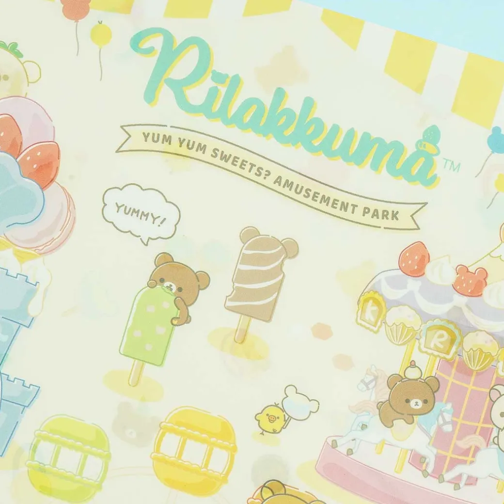 - A super cute clear A4 folder decorated with prints of Rilakkuma and his friends at the Yum Yum Sweets Amusement Park