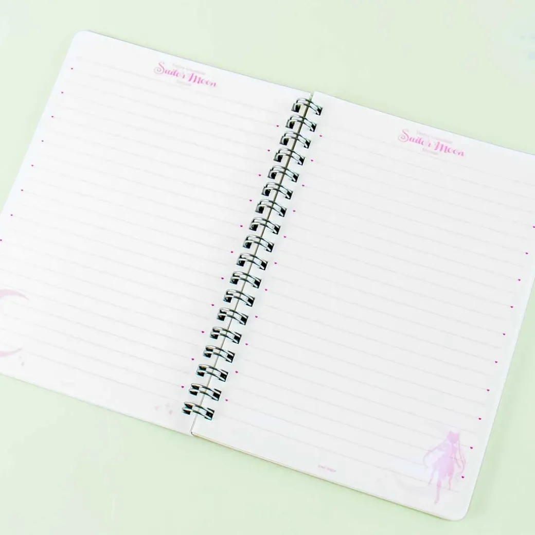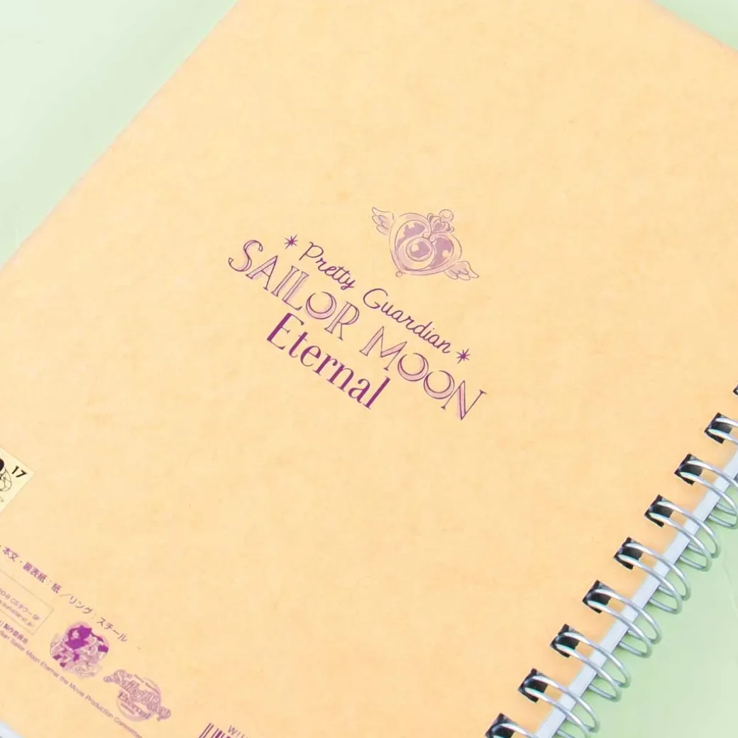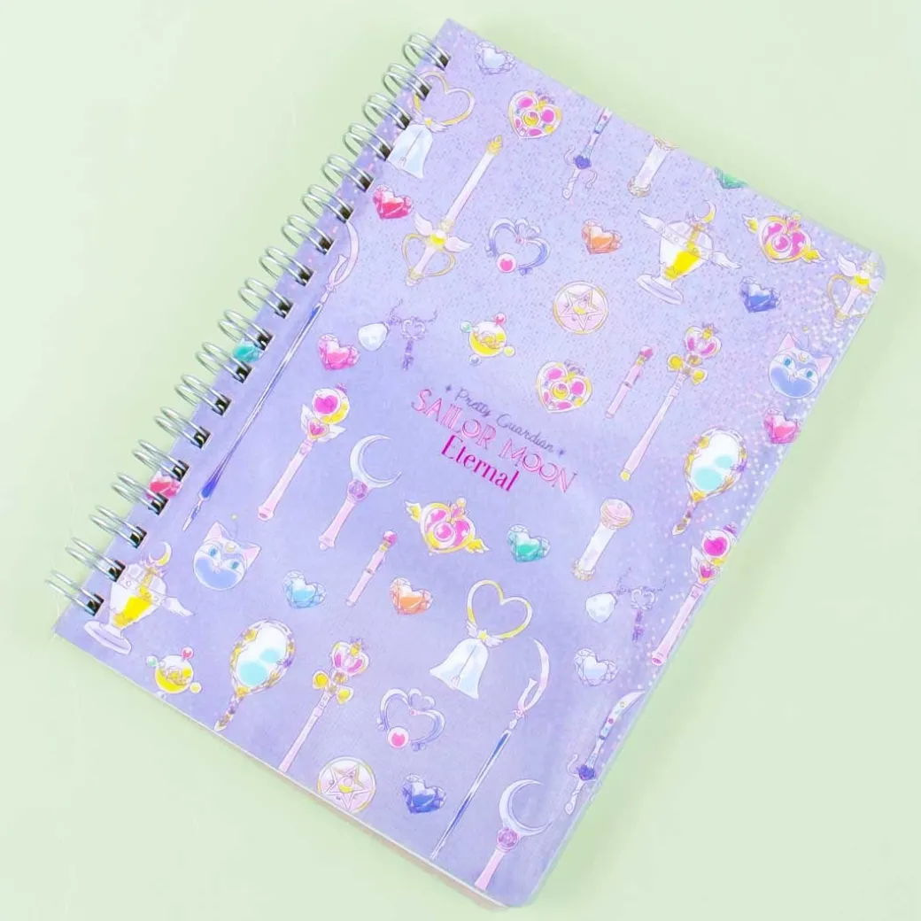 - A kawaii notebook with a glittery semi-transparent cover featuring different Sailor Moon accessories