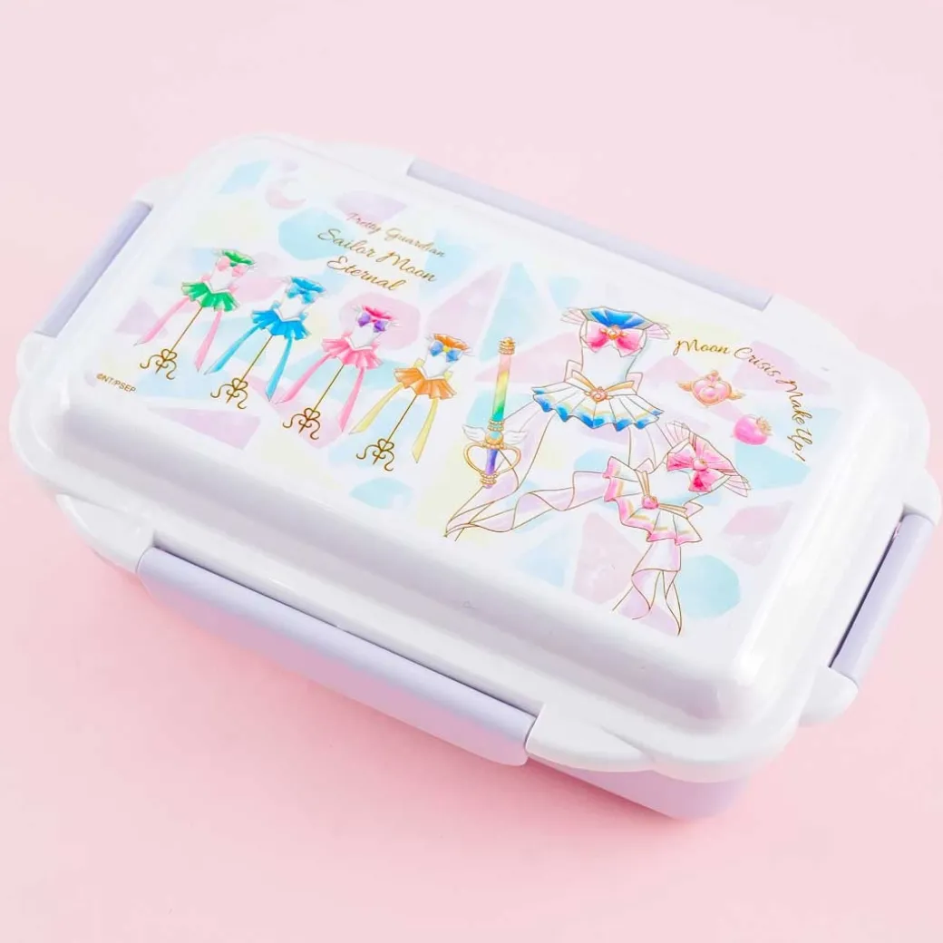 - A cute rectangle lunch box with illustrations of the Senshi costumes of Super Sailor Moon, Super Sailor Chibi Moon, and the main 4 Sailor Guardians