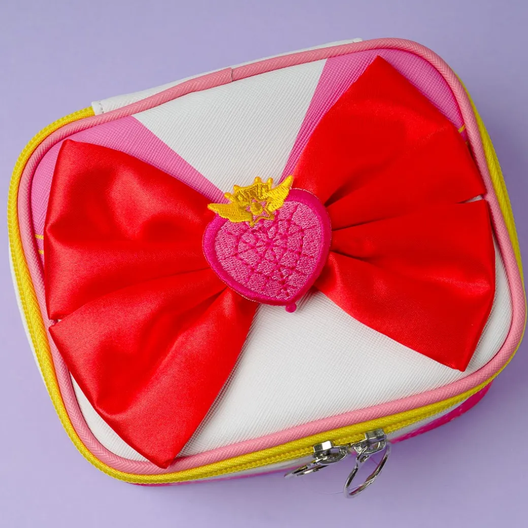 This kawaii vanity bag comes from Sailor Moon’s 30th Anniversary goodies. It features the Pretty Guardian’s fighting uniform colors and a big red bow at the top. Even the inner fabric is filled with cute illustrations and has a pocket for your makeup brushes!