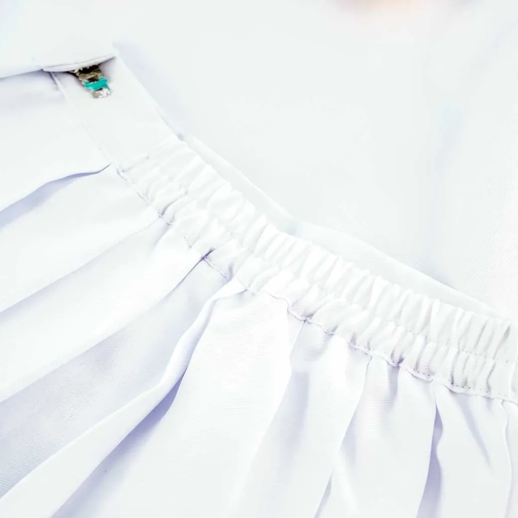 - Features a side zipper and elastic waist band for the skirt and side zipper and buttons for the top