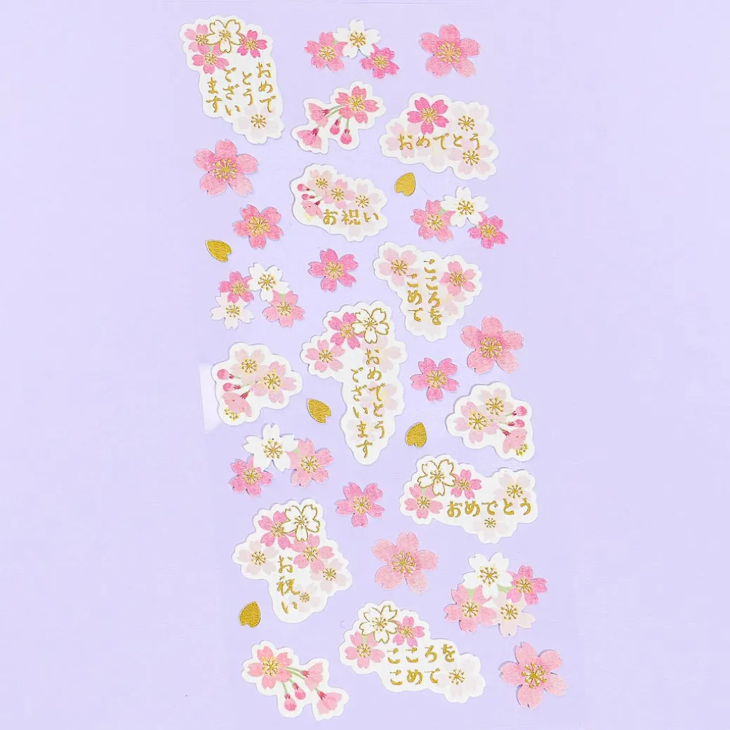 Use these kawaii die-cut stickers to seal your birthday invites! The sheet features cherry blossom illustrations and greetings of “thank you!” and “congratulations!” in Hiragana. Each piece also has special gold foil detailing!