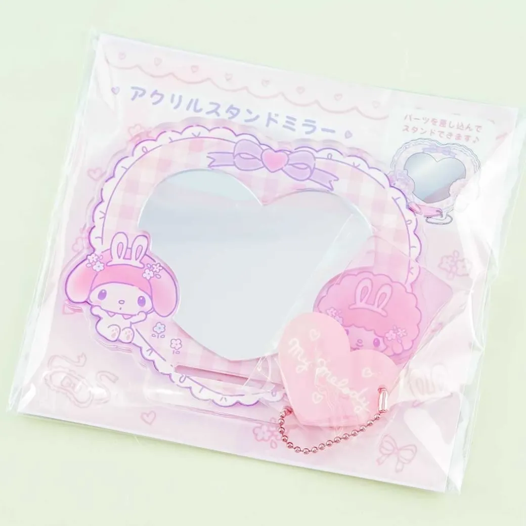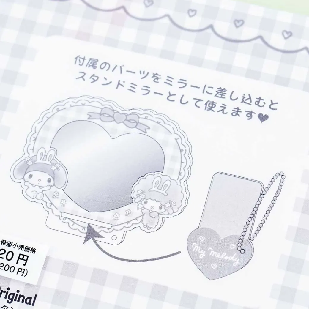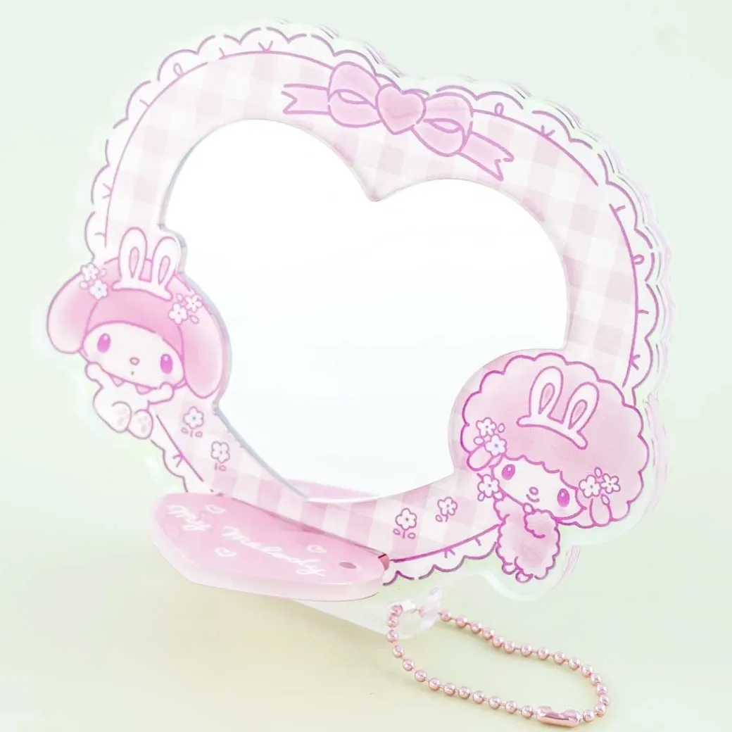 - A cute heart-shaped hand mirror that transforms into a standing mirror featuring My Melody with My Sweet Piano