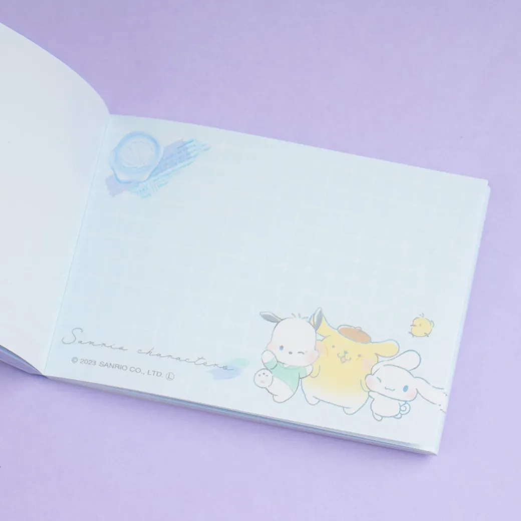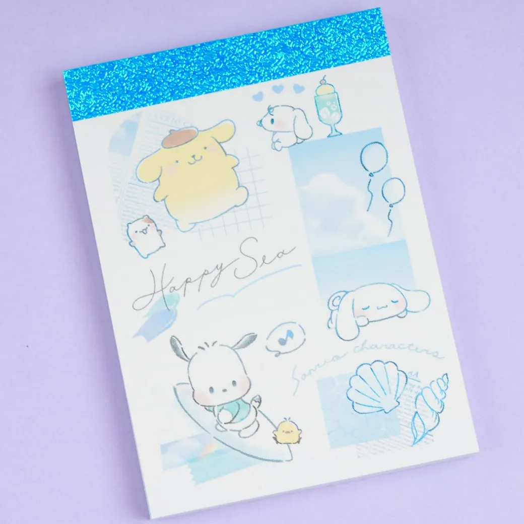 Have fun taking notes with this kawaii memo pad! It features illustrations of Pompompurin, Pochacco, Milk, and Cinnamoroll chilling together by the sea.
