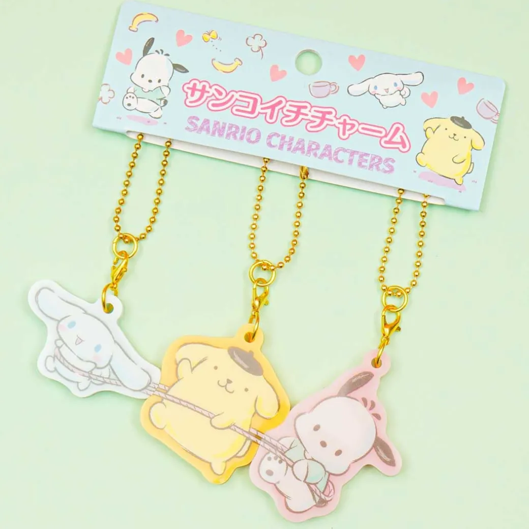 - A super cute 3-piece acrylic charm set featuring Pochacco, Pompompurin, and Cinnamoroll