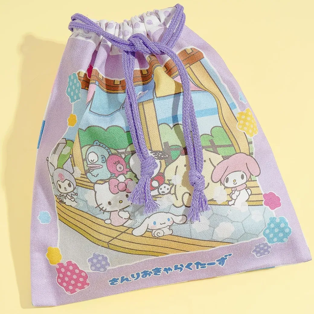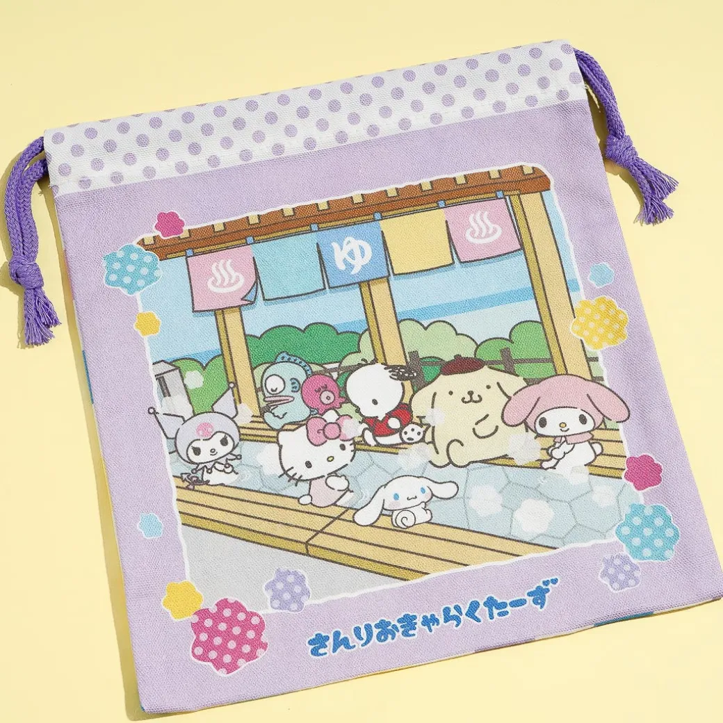 Use this kawaii drawstring pouch to carry your travel essentials! It features cute illustrations of Sanrio Characters gathered in an ashiyu or Japanese public bath.