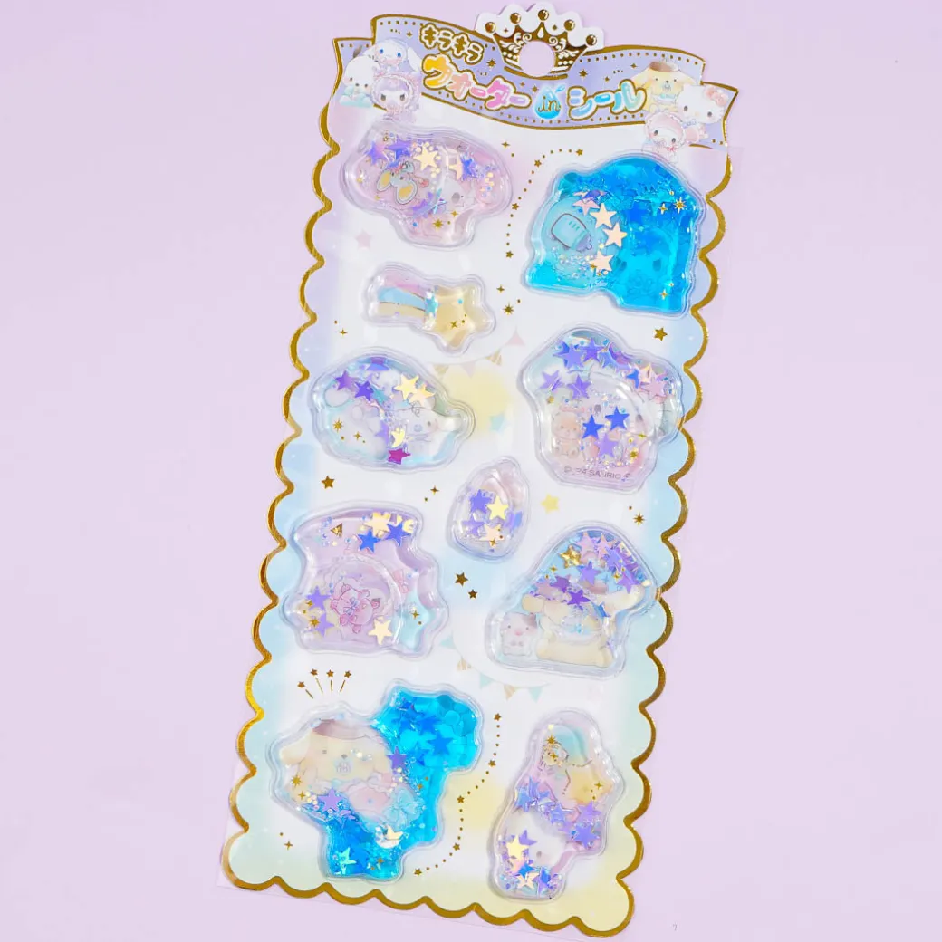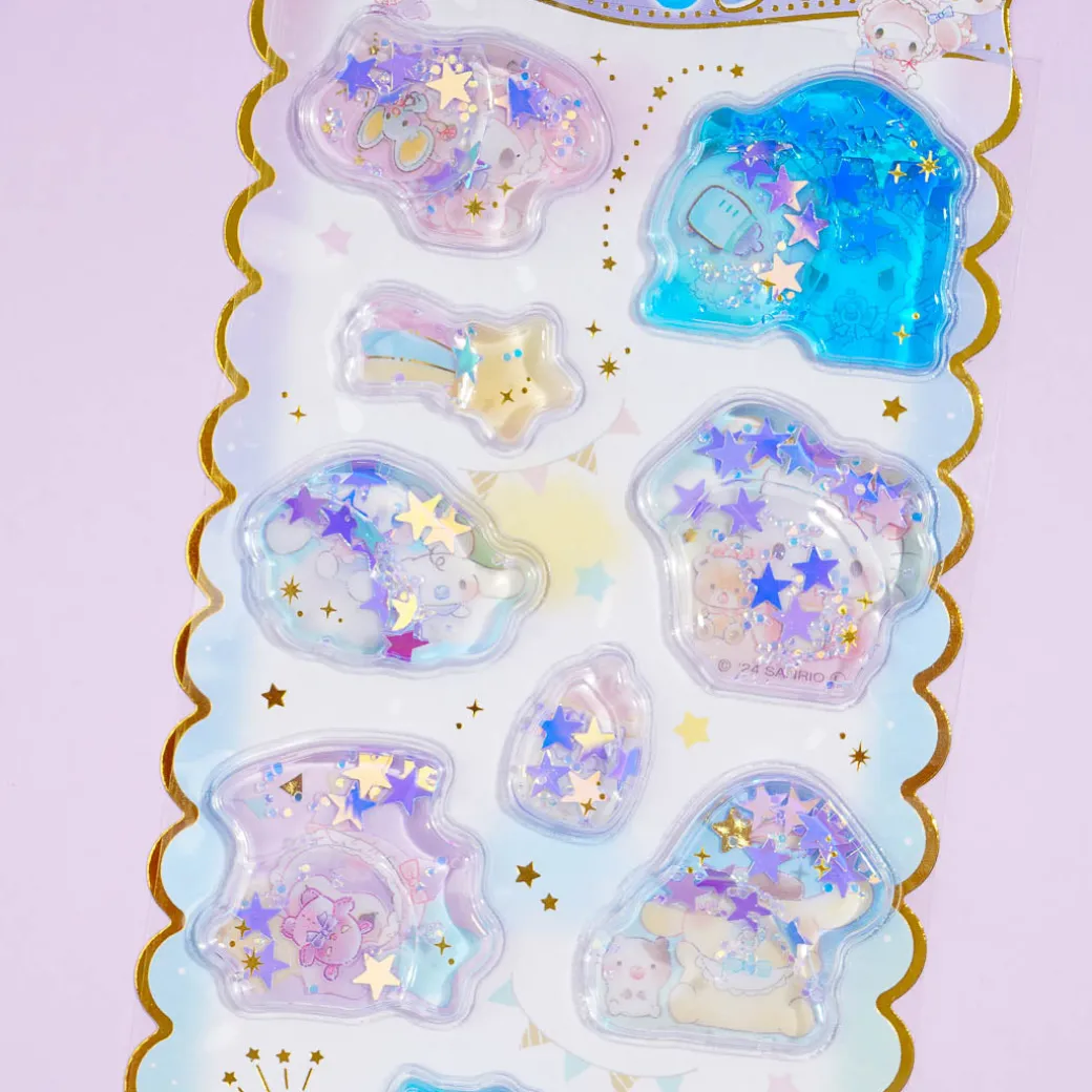 Kawaii-fy your smartphone case by decorating it with these special puffy stickers! Each die-cut piece contains water filled with floating stars and glitter inside! The sheet also features cute prints of the Sanrio Characters dressed as babies.