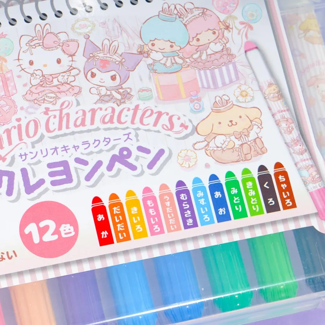 Grab a coloring book and have fun with these kawaii twistable crayon pens. They come in a plastic container decorated with illustrations of the Sanrio Characters wearing bunny ears. Each pen has a cap and plastic barrel body you’ll need to twist to dispense the color.