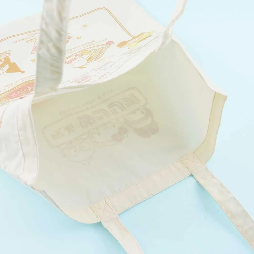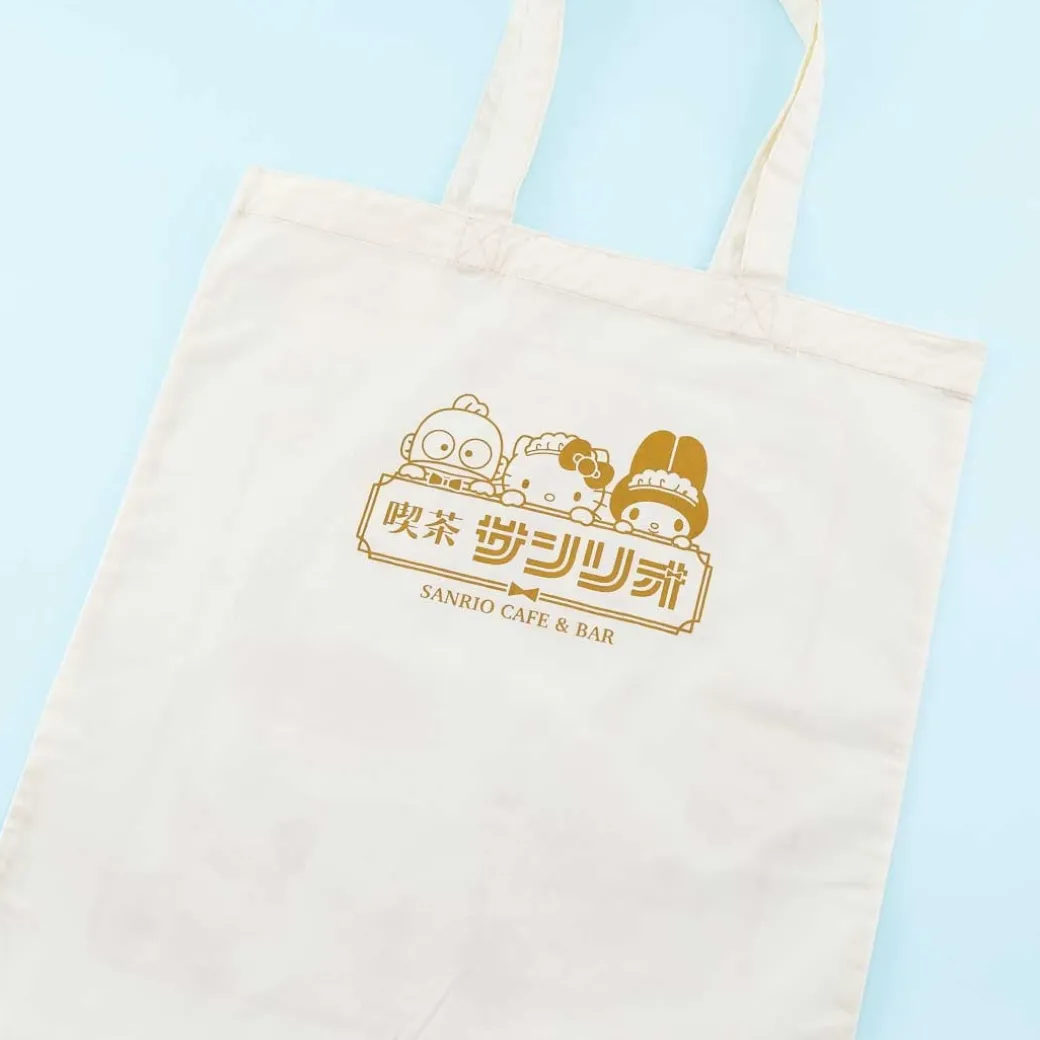 - A kawaii reusable tote bag with a retro-inspired café and bar menu board print featuring popular Sanrio Characters
