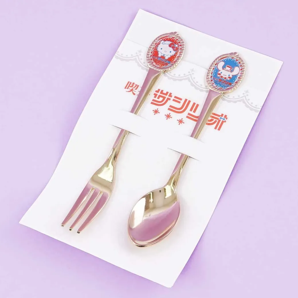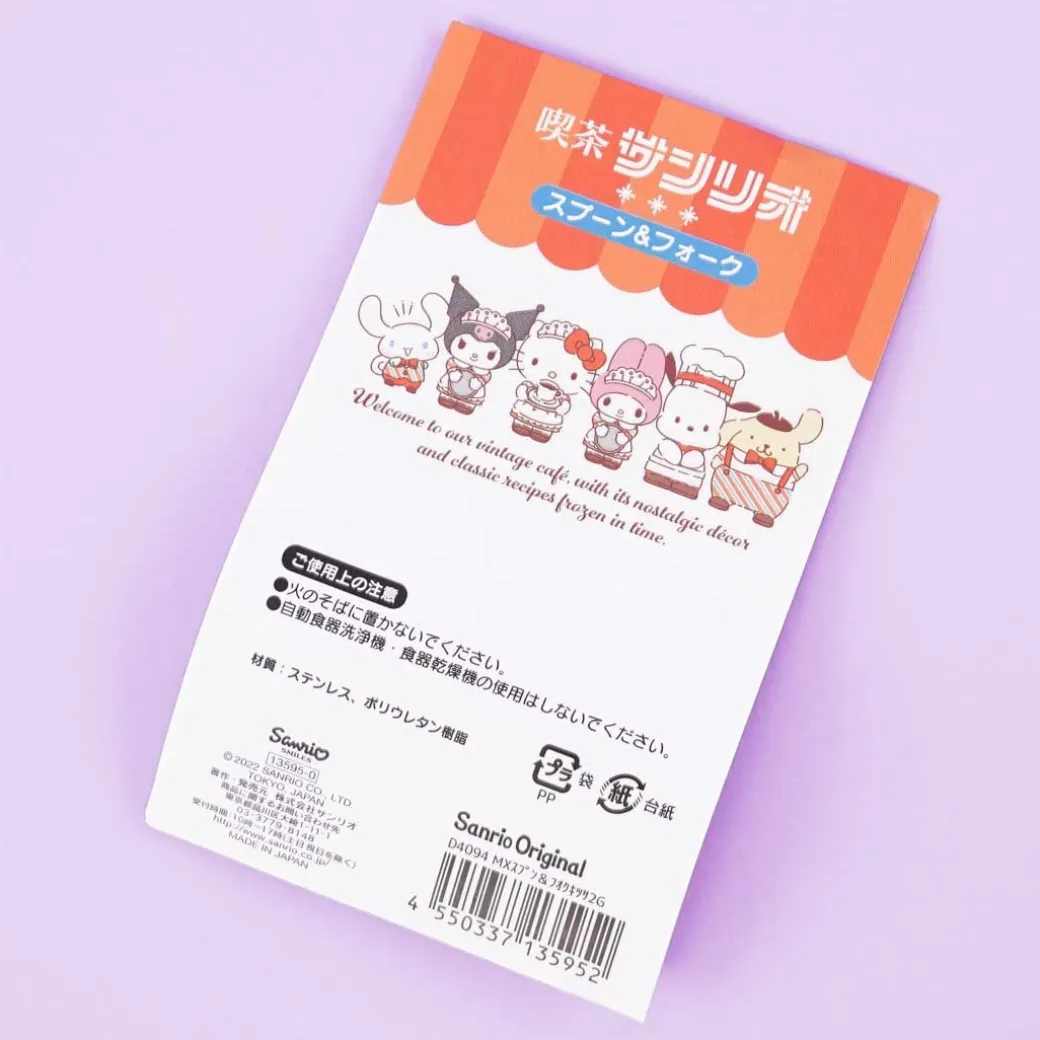 - A kawaii stainless steel spoon and fork set illustrated with Hello Kitty and Cinnamoroll dressed for a cafe