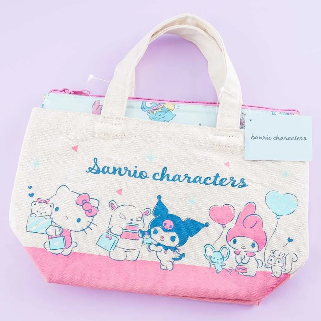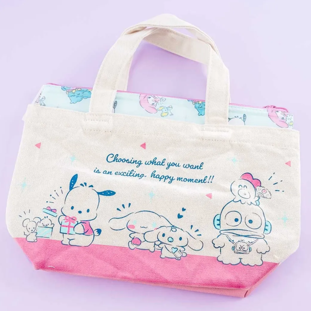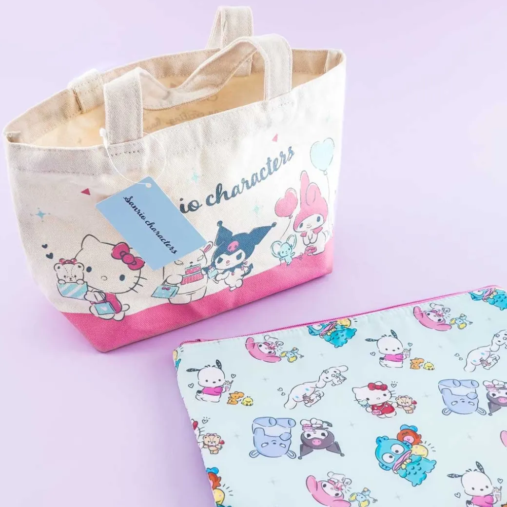 - A super cute canvas tote bag and pouch set illustrated with different Sanrio characters doing different things
