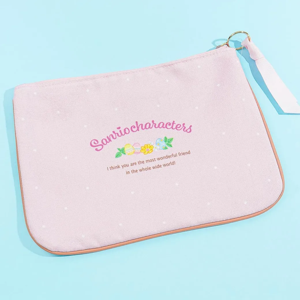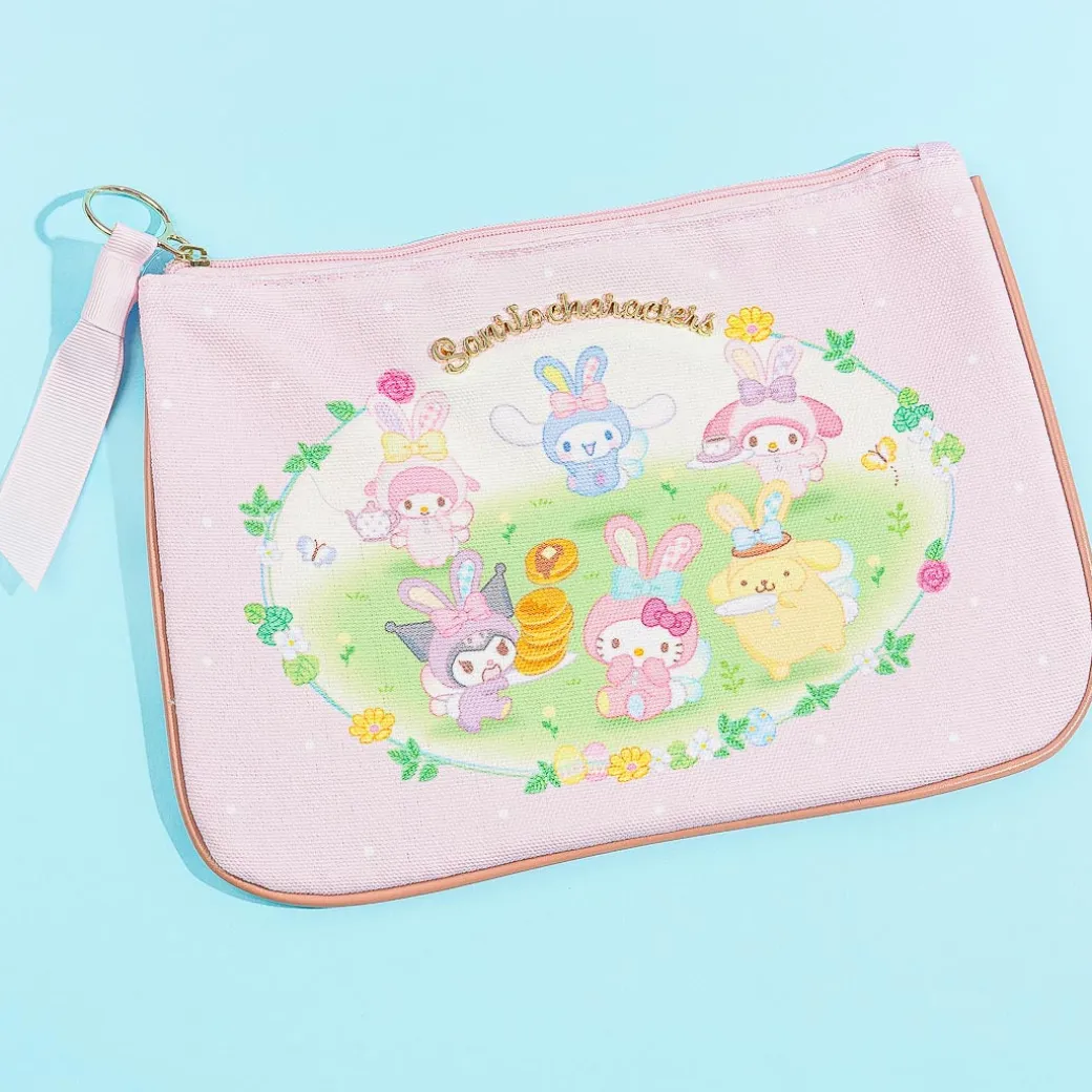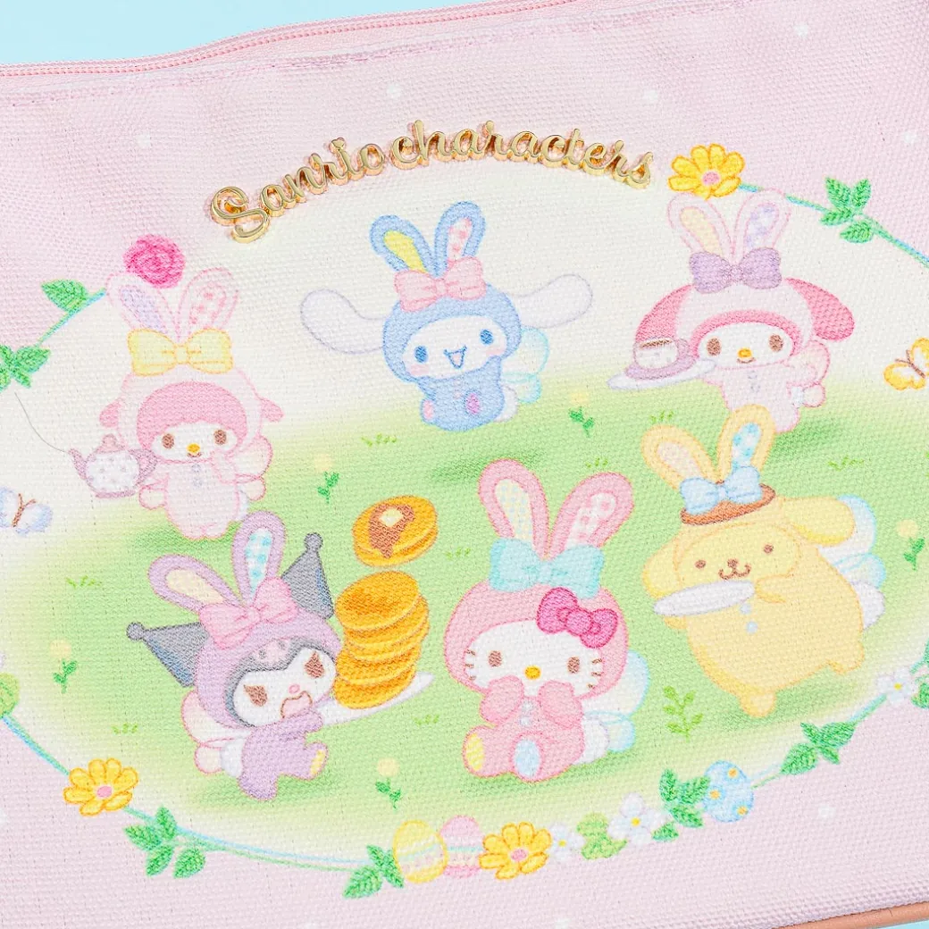 Store your trinkets or cosmetics inside this super kawaii pouch! It showcases spring illustrations of Sanrio Characters dressed like Easter bunnies. The pouch has a synthetic leather lining and a metal Sanrio Character logo, giving it a cute look!