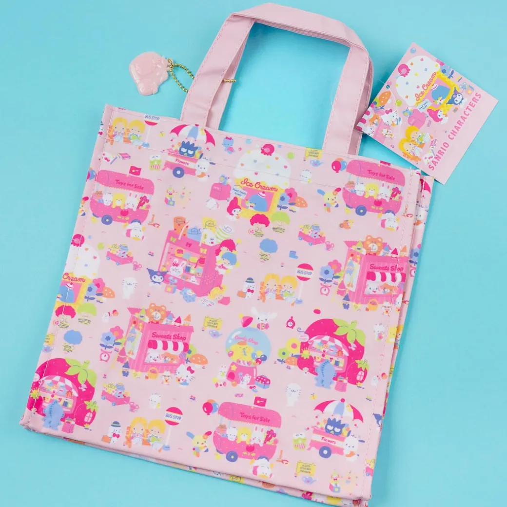 This kawaii hand bag features culte prints of the Sanrio Characters with their fancy shops! The bag has a short handle, you can use it to carry around your lunch.