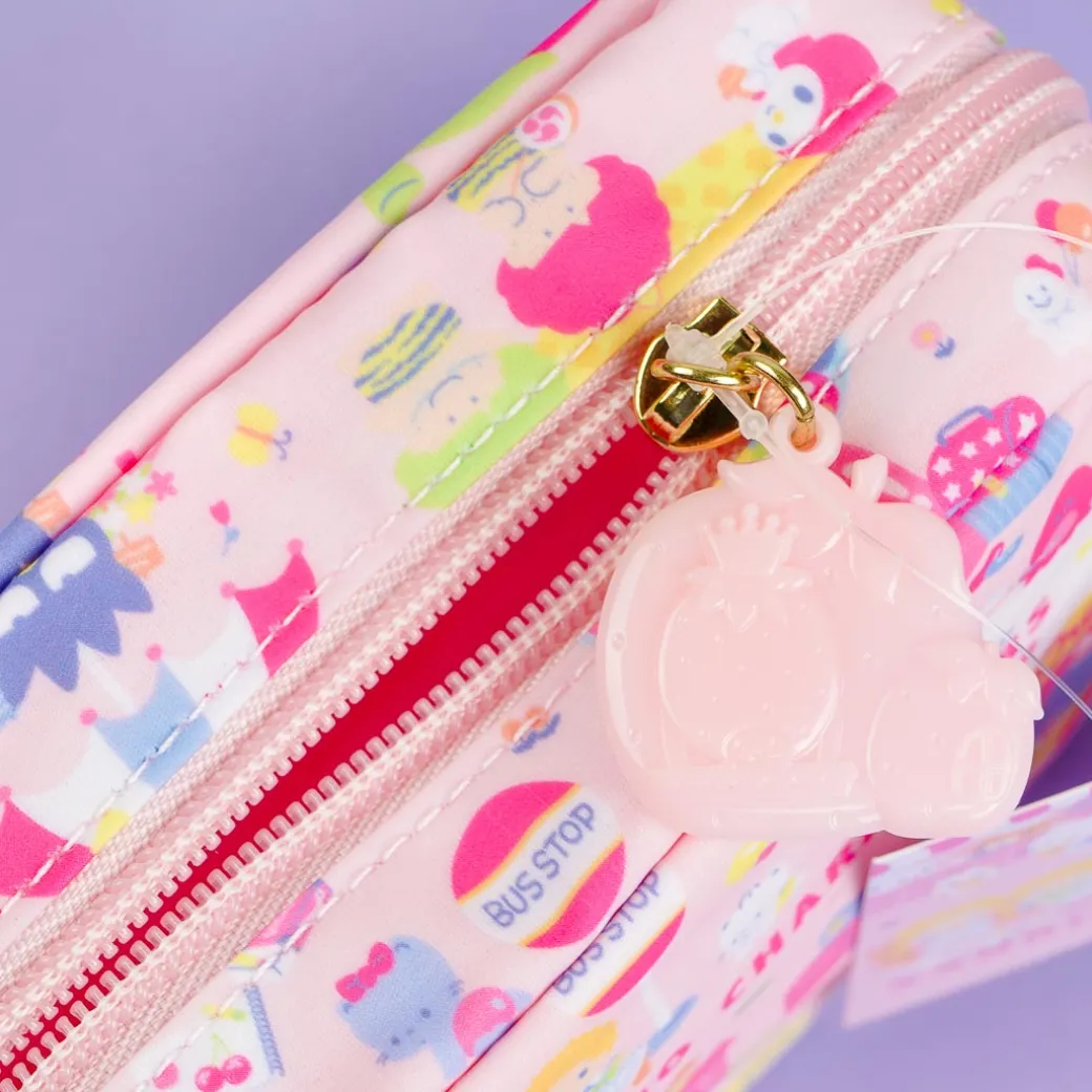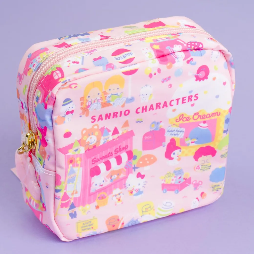 This zippered pouch is perfect for Sanrio lovers! It features cute prints of the Sanrio characters with their fancy shops. Use this square-shaped pouch as a makeup kit.