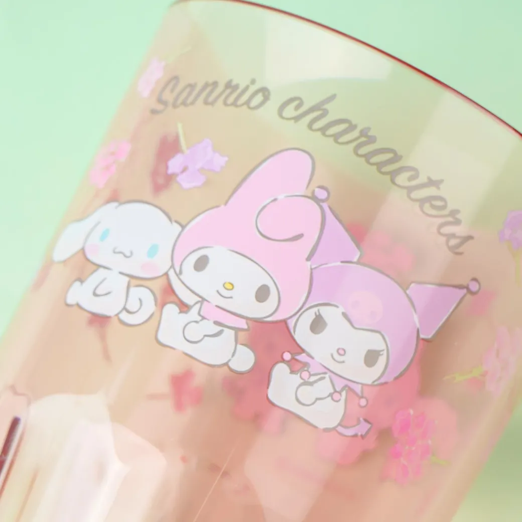 Make yourself a tasty drink with this kawaii transparent cup! It features a cute print of Cinnamoroll, My Melody, and Kuromi all together with tons of flowers. Not recommended for microwave and dishwasher use.