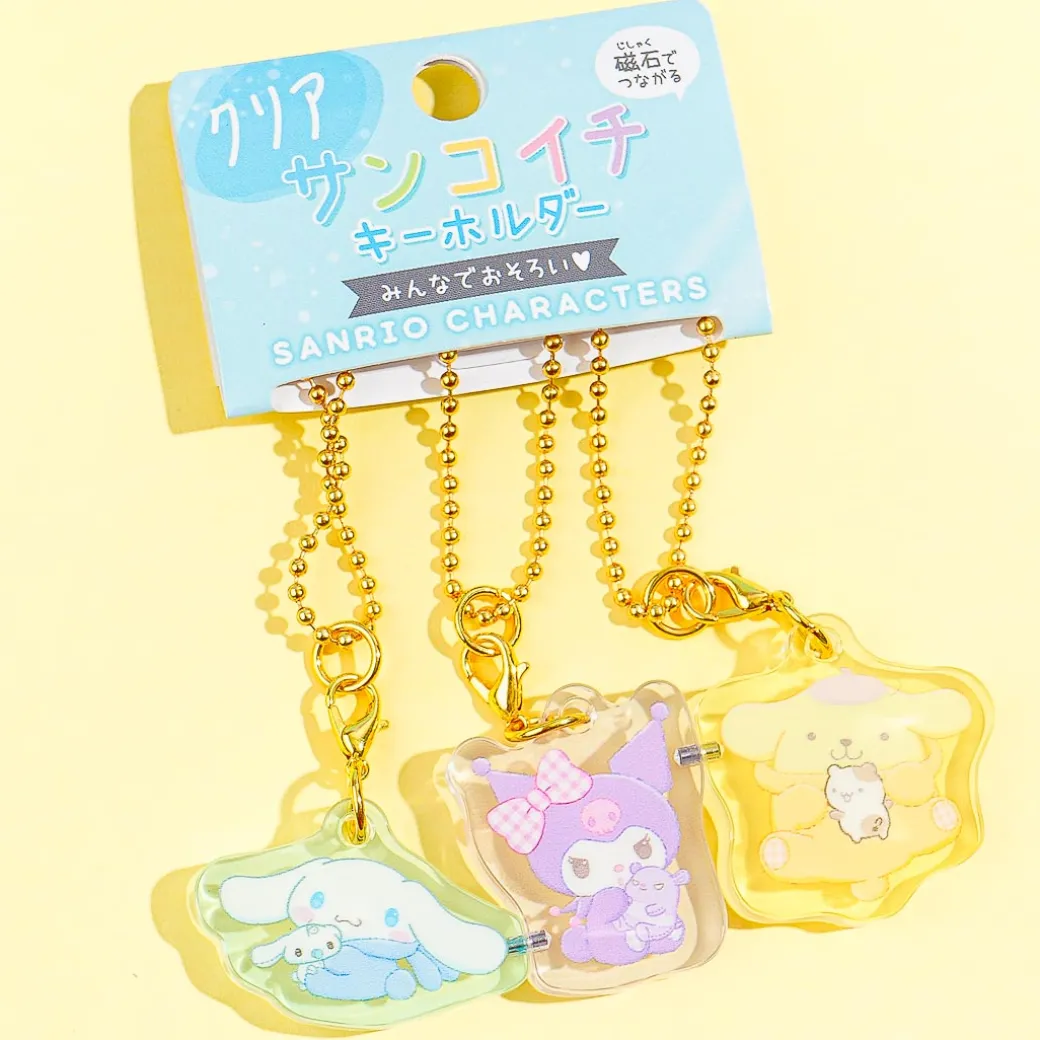 You and your buddies can have matching charms with this super cute set! Each die-cut acrylic charm features a Sanrio Character wearing a fluffy onesie. The charms are magnetic so they stick together!