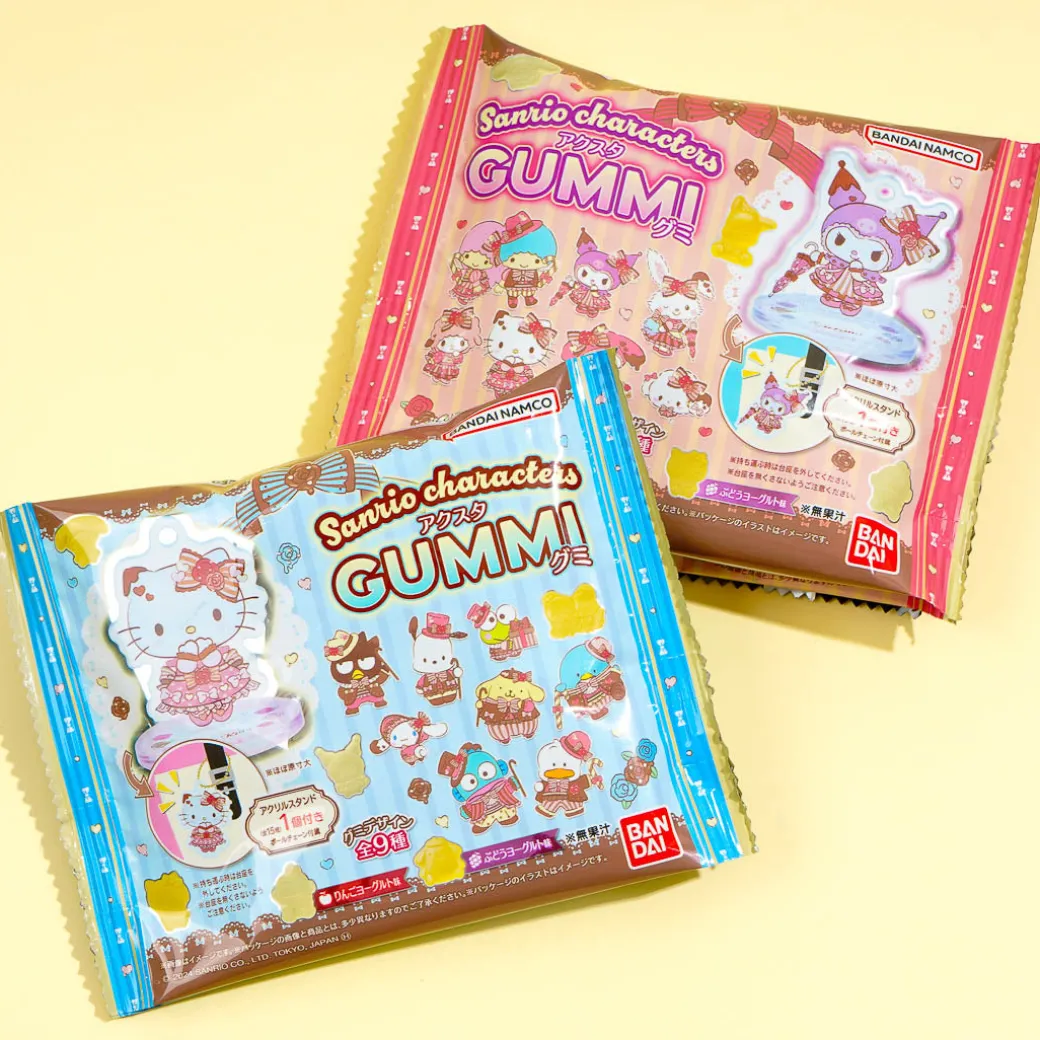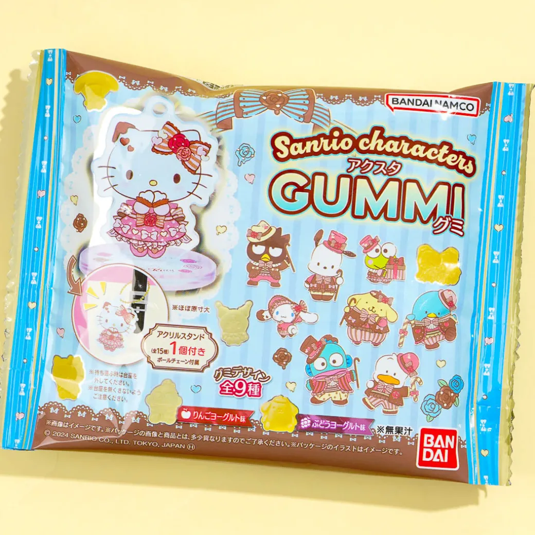 Nibble on this pack of grape yogurt and apple yogurt-flavored gummy candies while watching your favorite show. It features prints of Sanrio cuties all dressed up! This pack of gummies comes with a collectible acrylic stand illustrated with a Sanrio character. Surprise yourself with a random acrylic stand from a set of 15 designs when you order!