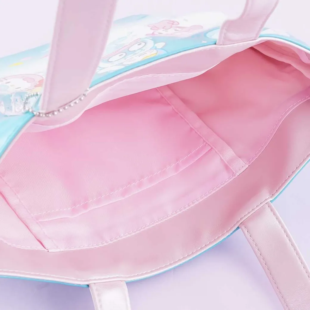 - A super kawaii tote bag covered in prints of Sanrio characters in an ice land wearing cute costumes