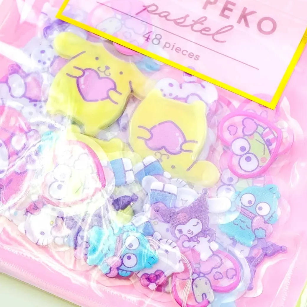 - A kawaii resealable pack of pastel-colored stickers featuring different Sanrio characters