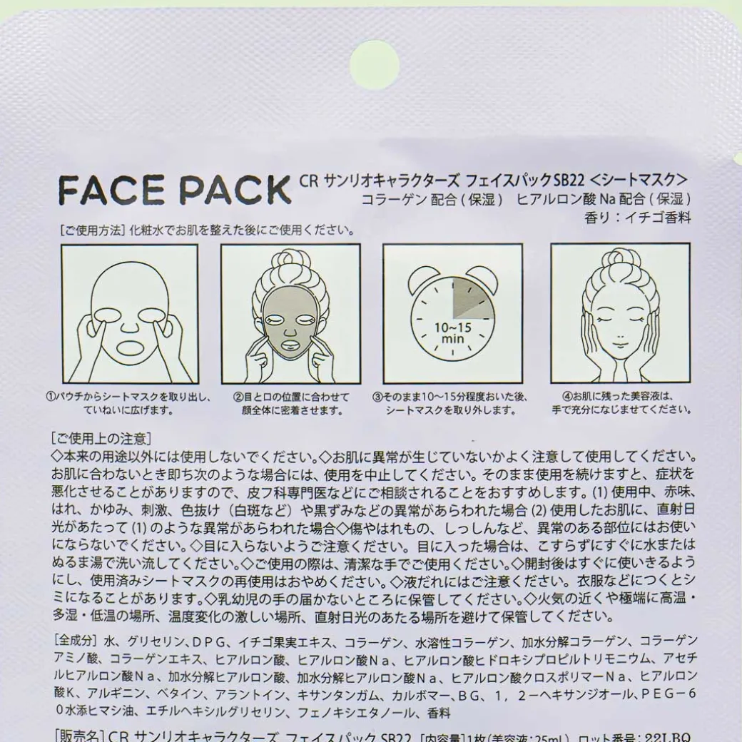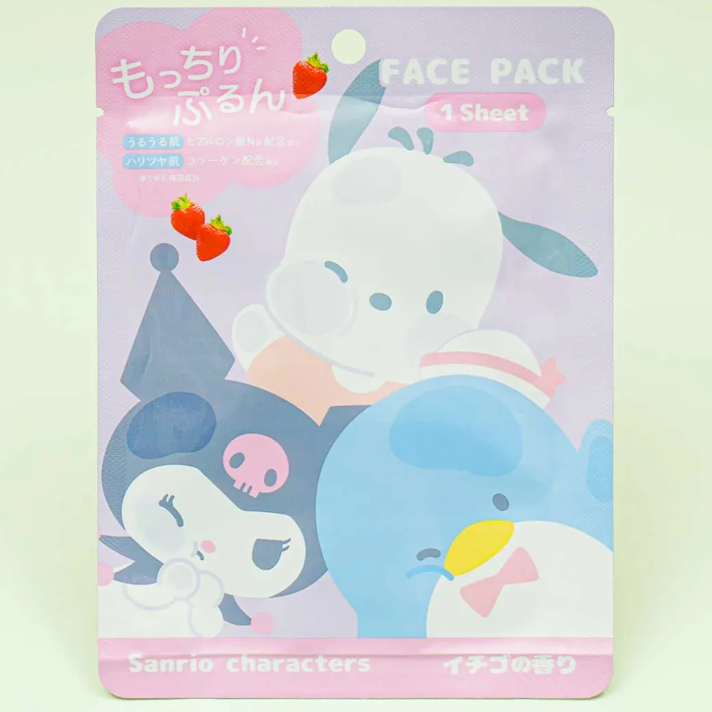 Keep your face feeling smooth by using this face pack sheet mask! It contains beneficial collagen and hyaluronic acid. The purple packaging has kawaii illustrations of popular Sanrio Characters Kuromi, Pochacco, and Tuxedosam.