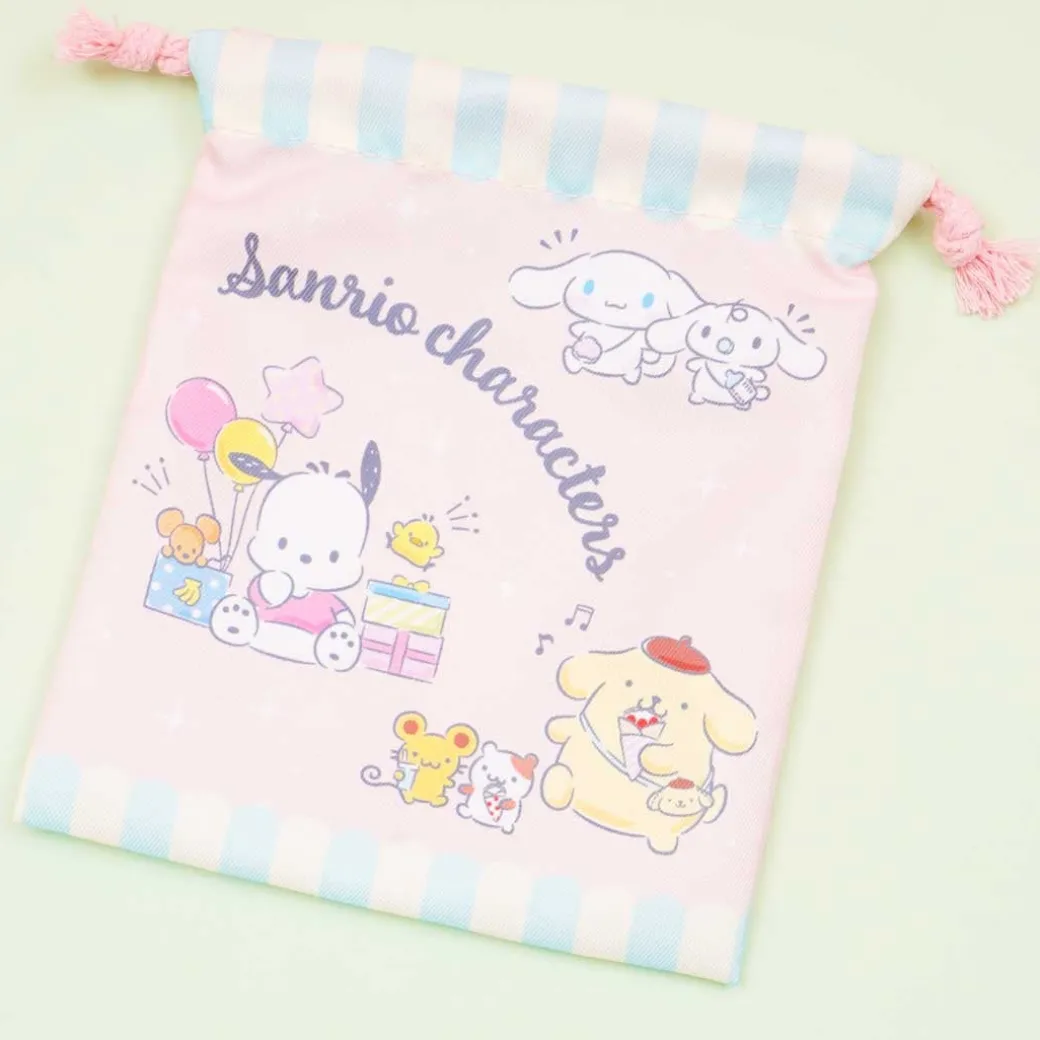 - A cute drawstring pouch illustrated with Sanrio characters partying