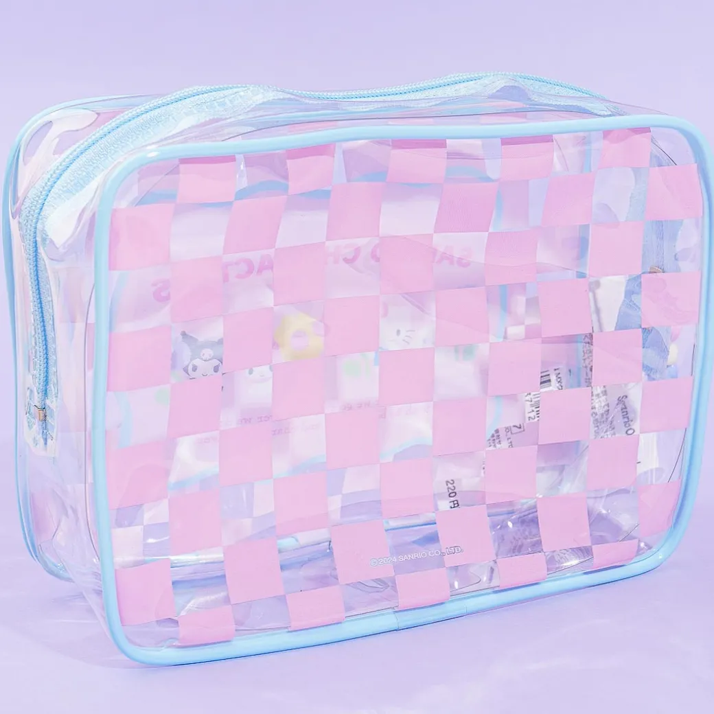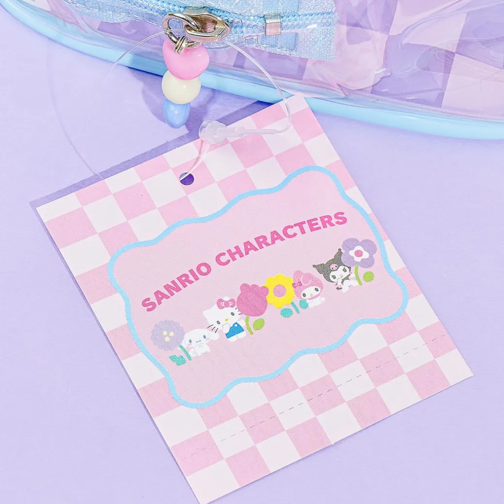 This clear vinyl pouch is decorated with a cute checkered pattern and illustrations of Sanrio Characters holding flowers. Its box-type design makes it perfect for storing cosmetics, stationery, and other trinkets!