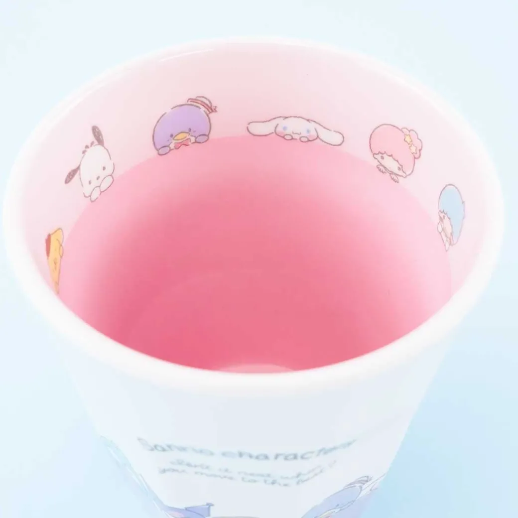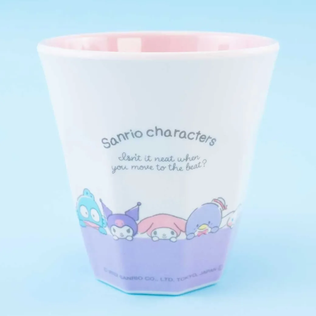- A super cute cup featuring prints of Sanrio characters peeking from a ledge