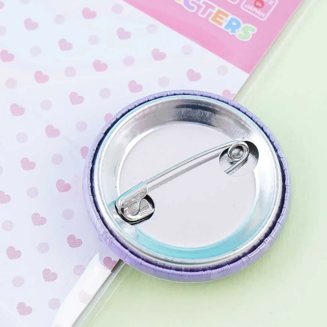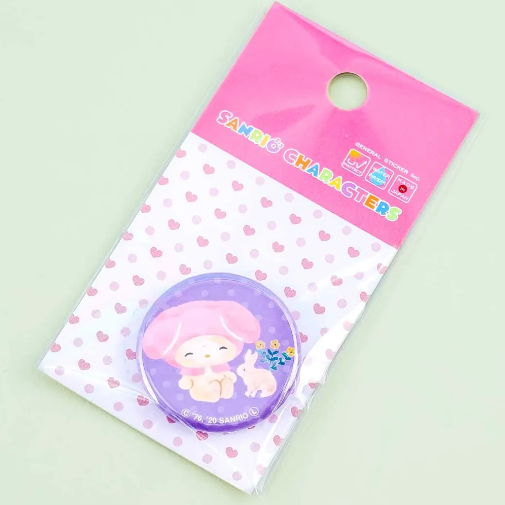 - A steel badge featuring a retro illustration of My Melody, a bunny, and polka dots
