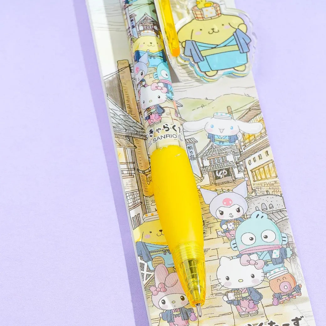 Write entries in your planner with this kawaii pen from the Sanrio Characters Showa Hot Spring series. It features prints of cuties from Sanrio wearing onsen yukatas from the Showa era in Japan. This pen has a cute acrylic charm showcasing Pompompurin in a yukata!