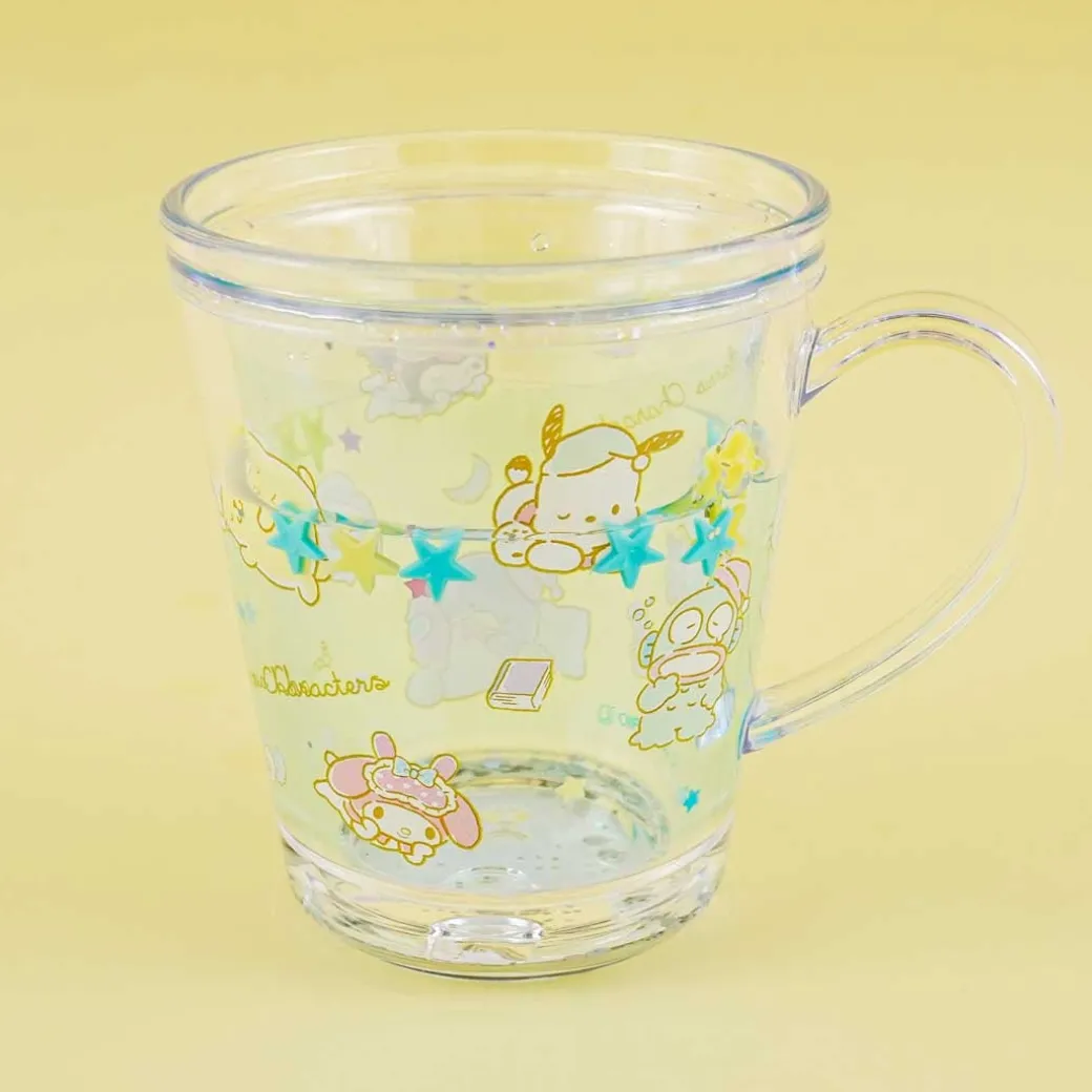 This cute cup is covered in prints of sleepy Sanrio characters. Use it to take a sip of your favorite drink! This cup also has a layer of water with floating stars and confetti. A kawaii cup showcasing sleepy Sanrio characters Features a layer of water with floating stars and confetti Volume: 250 ml / 8.45 oz Can withstand temperatures up to 70°C Original licensed product from Sanrio Japan